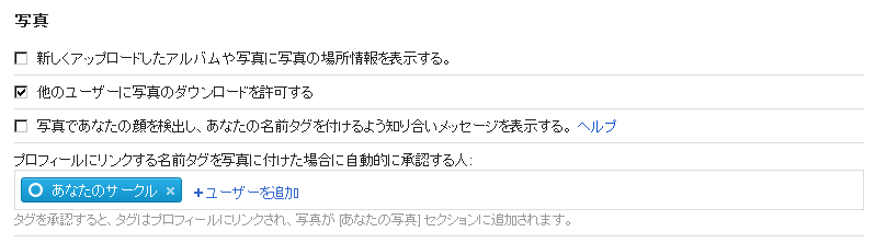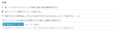“新しくアップロードしたアルバムや写真に写真の場所情報を表示する”の設定は要注意です。自分の住所や訪問地がダダ漏れになります。特にモバイルからの投稿時は要注意です。「どこに行った!」といった訪問地アピール目的以外では、場所情報は使わない方が無難だと思います。