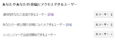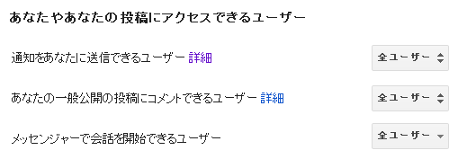 “あなたの一般公開の投稿にコメントできるユーザー”や”メッセンジャーで会話を開始できるユーザー”も同様です。知らない人からのコメントを貰いたくない、とか、知らない人からハングアウトに誘われたくない、という場合はここで制限できます。