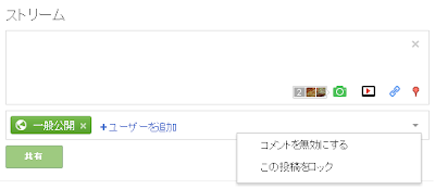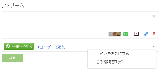 投稿する際に、投稿欄右下の▼をクリックすると、コメントを受け付けないようにする設定と、再共有を禁止(ロック)する設定ができます。特に投稿ロックは、限定公開の時に使うといいと思います。誰が勝手に再共有するか判らないし、再共有されると自分の意図しない公開範囲に見えてしまう可能性があるからです。