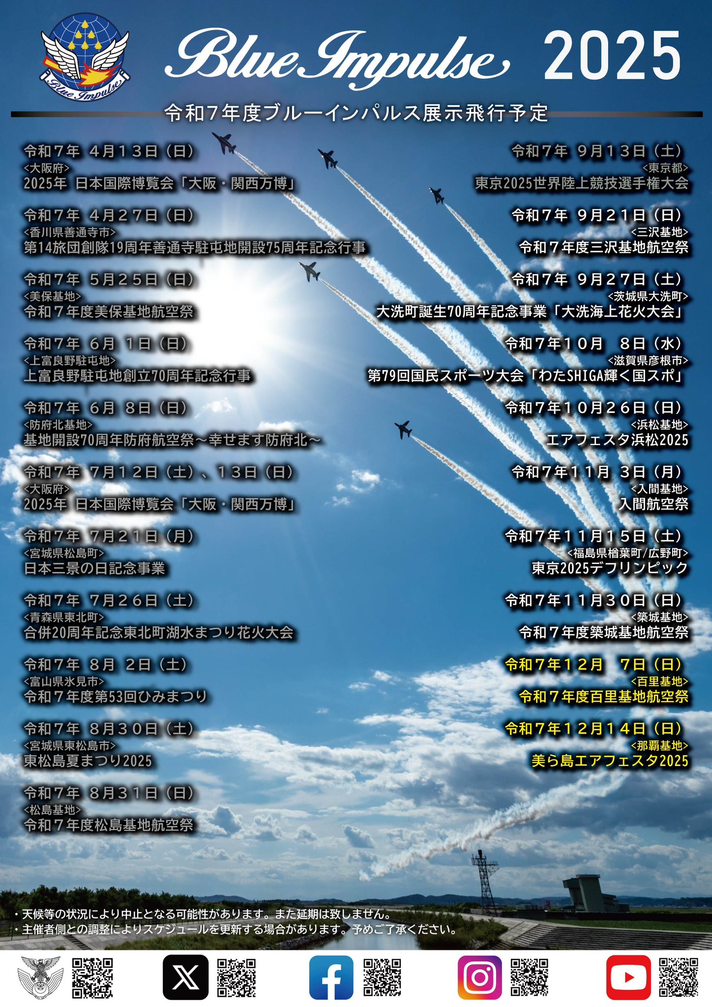 ・展示飛行は、天候等の理由により中止となる場合があり、延期は致しませんのでご了承ください。