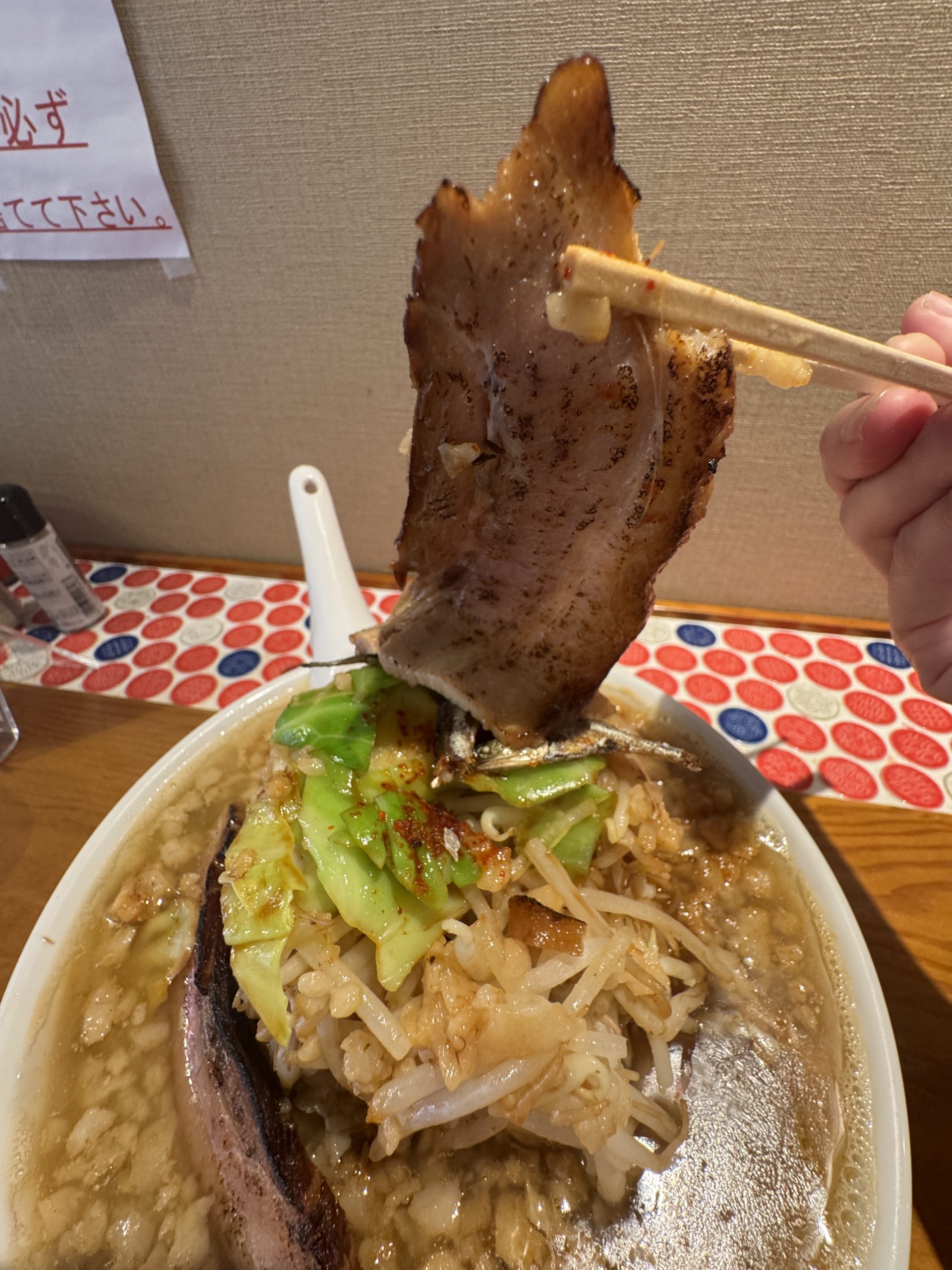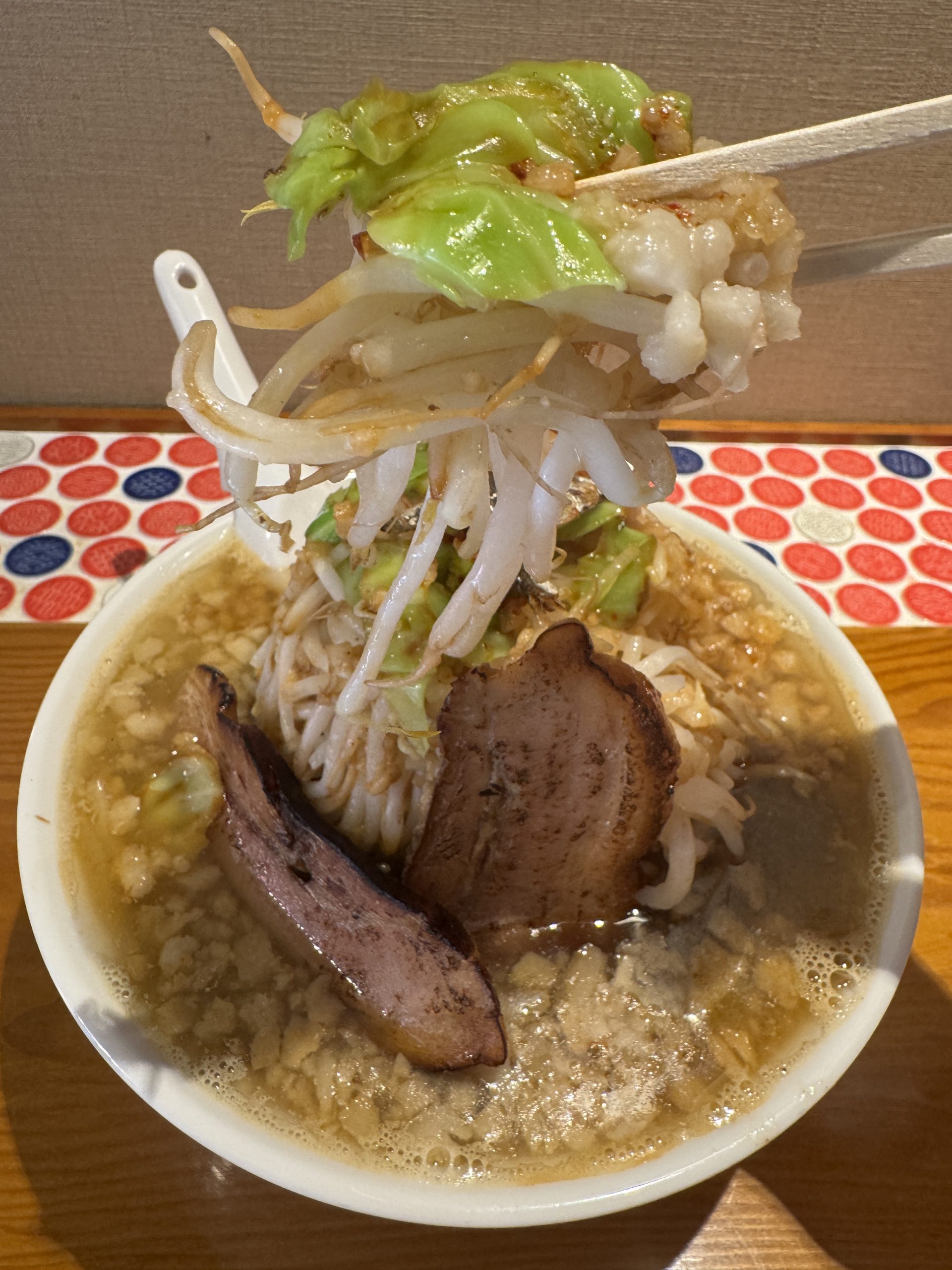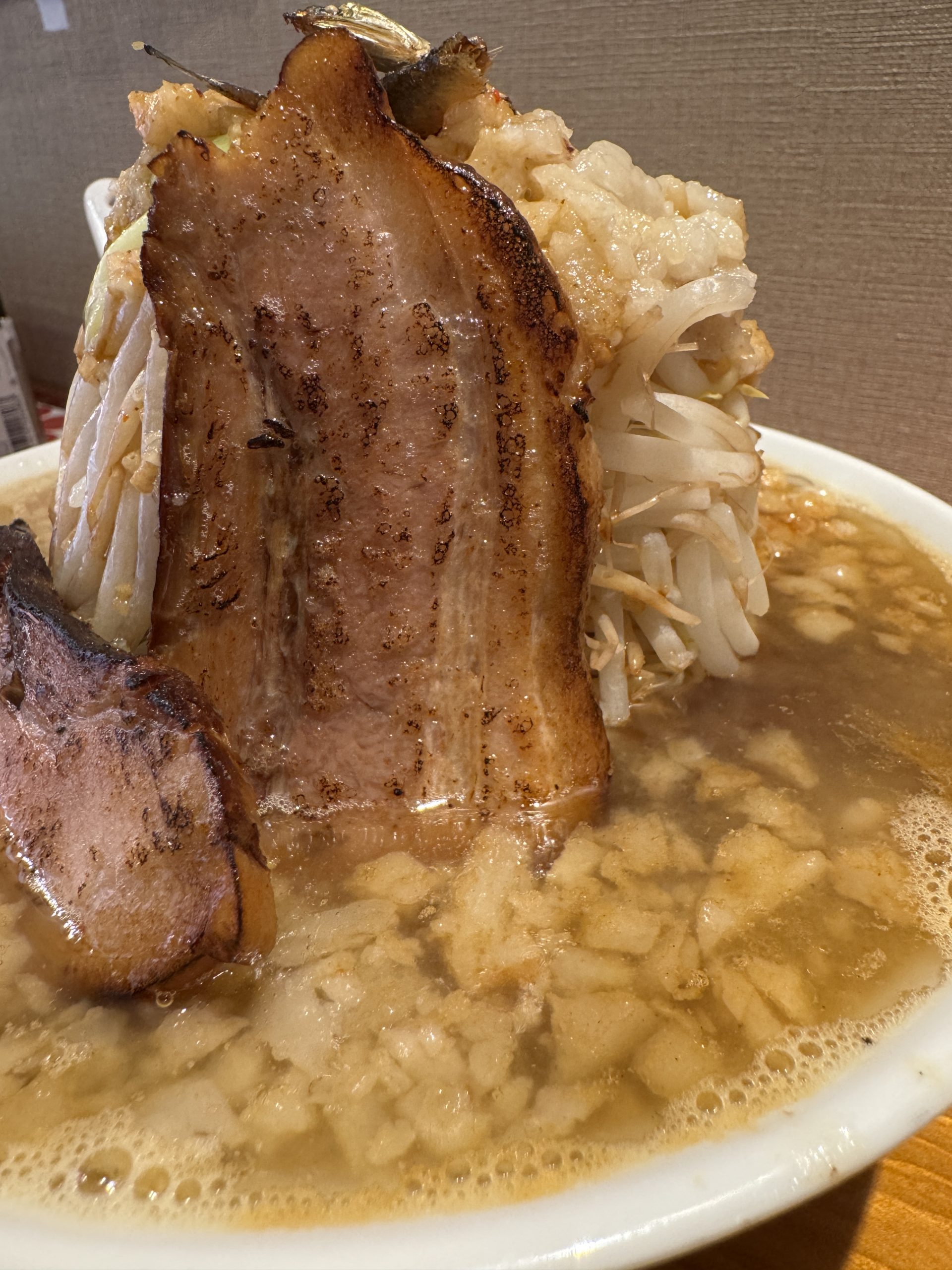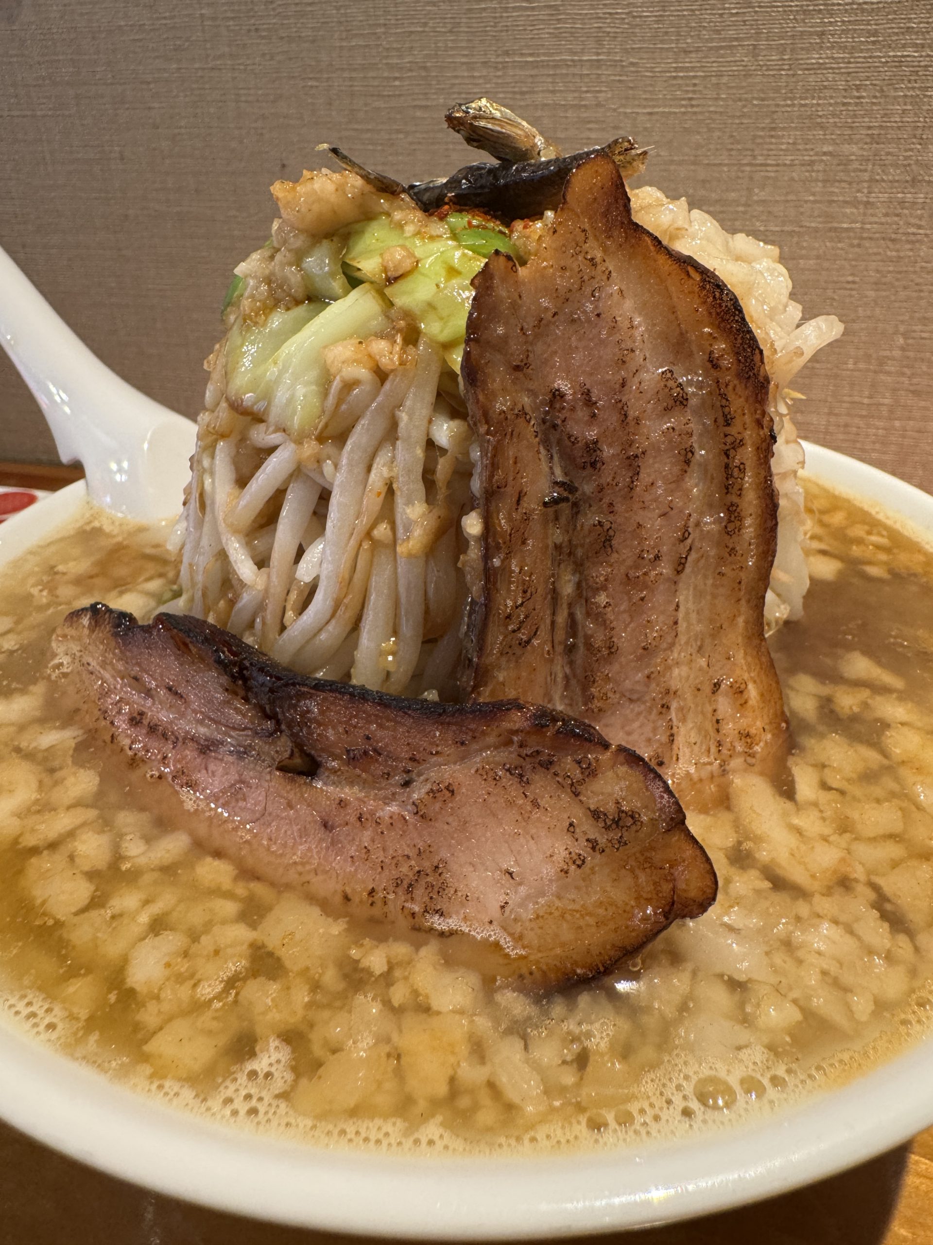 でぶちゃん+ももちゃん+ラーメン二郎インスパイア。ドラゴンボールでたとえると、孫悟空とベジータがフュージョンしてスーパーサイヤ人ゴッドになるようなものだろうか。その状態で一回ピンチになり、仙豆を食べて復活してもっと強くなったようなものだろうか。なんかよくわからなくなってきた。たとえ方が間違っていた。