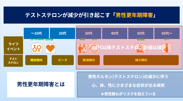 テストステロンは筋肉や骨、性機能、気力、集中力など、男性の健康と活力を支える重要なホルモンであり、これが年齢とともに減少することで、さまざまな症状が現れることがあります。