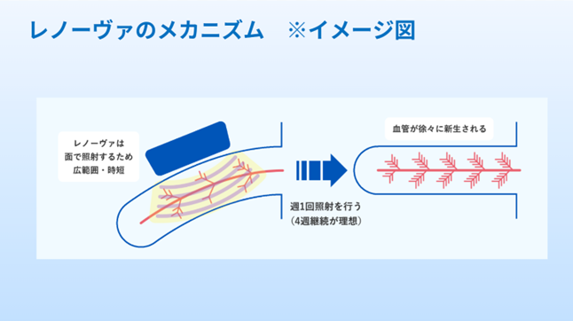 泌尿器の分野で先進的な技術を持つ、イスラエルのダイレックス社で開発されたED治療機器「レノーヴァ」を導入し、衝撃波を陰茎に照射することで血管の再生と血流改善を促します(下図参照)。
