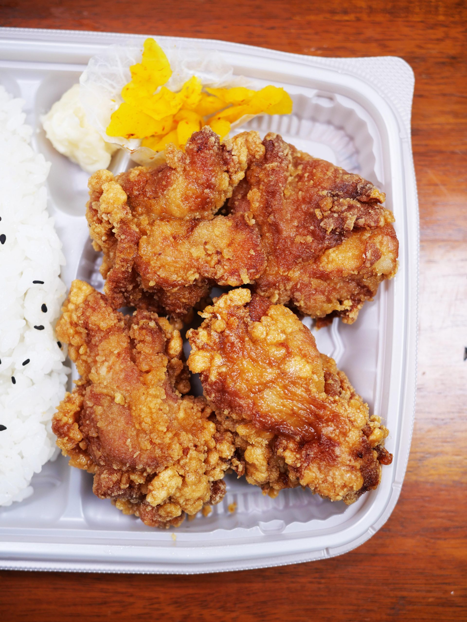 実際に買って食べてみた。構成は、ライスと唐揚げがメイン。潔ささえ感じる具のシンプルさ。漬物とポテトサラダもあるが、一口ほどの量。ライスと唐揚げのみで楽しむ、マジでシンプルな構成。