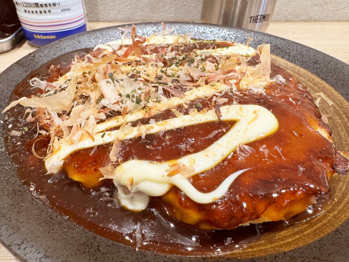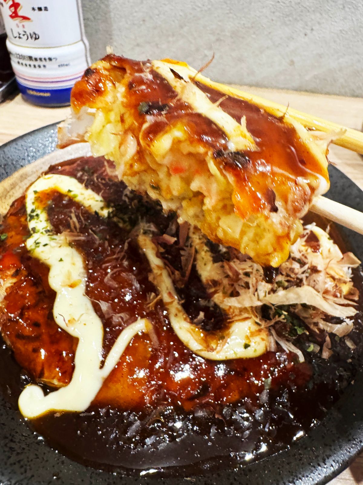 雰囲気的に清潔感があって、カジュアルで入りやすい店舗。店内はやや狭いけど、それでも居心地が良い不思議感。フレンドリーで優しい店員さん。たこ焼きと豚玉のお好み焼きをオーダーし、カウンター席に座って待つ。いい香りが漂ってくる。