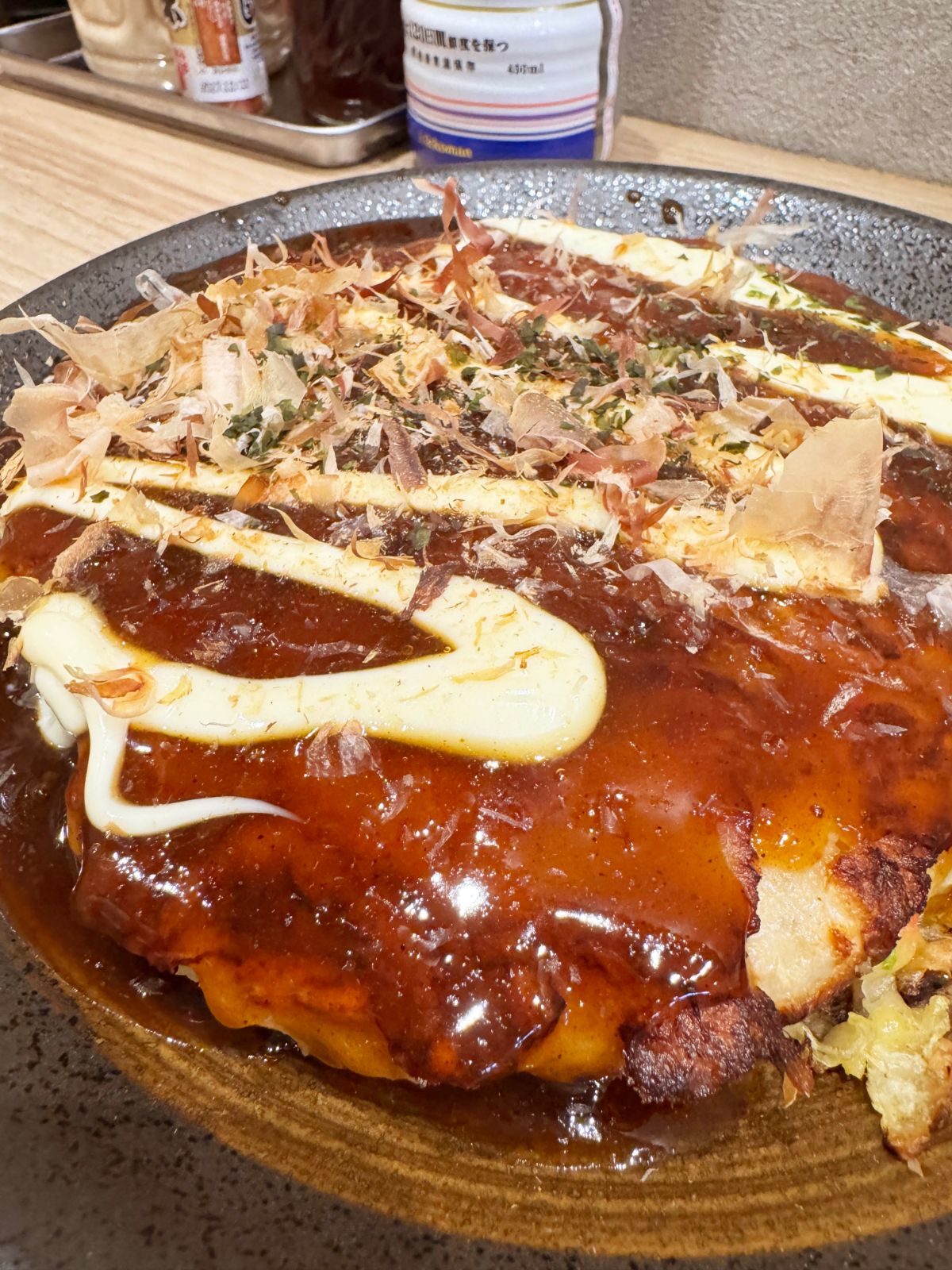 お好み焼きも、強めの甘味が楽しめる。もしかすると、たこ焼きとお好み焼き、どちらも同タイプのソースかも。どちらもオーダーする場合は。ソースのパワフルさが先行するので、ソースを少なめするか、たこ焼きのテイストをソース味以外にするとベストかもしれない。