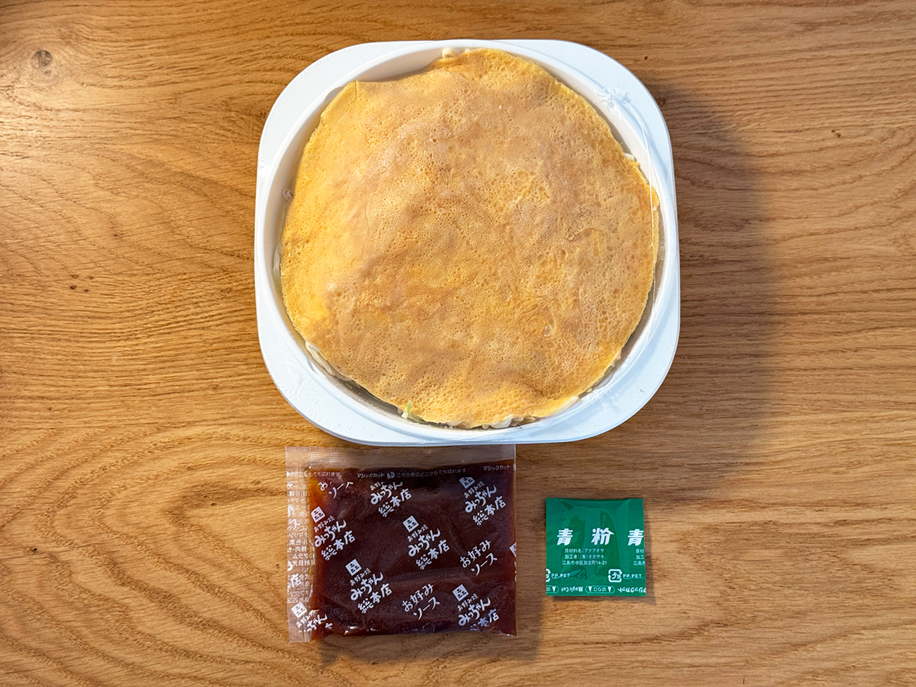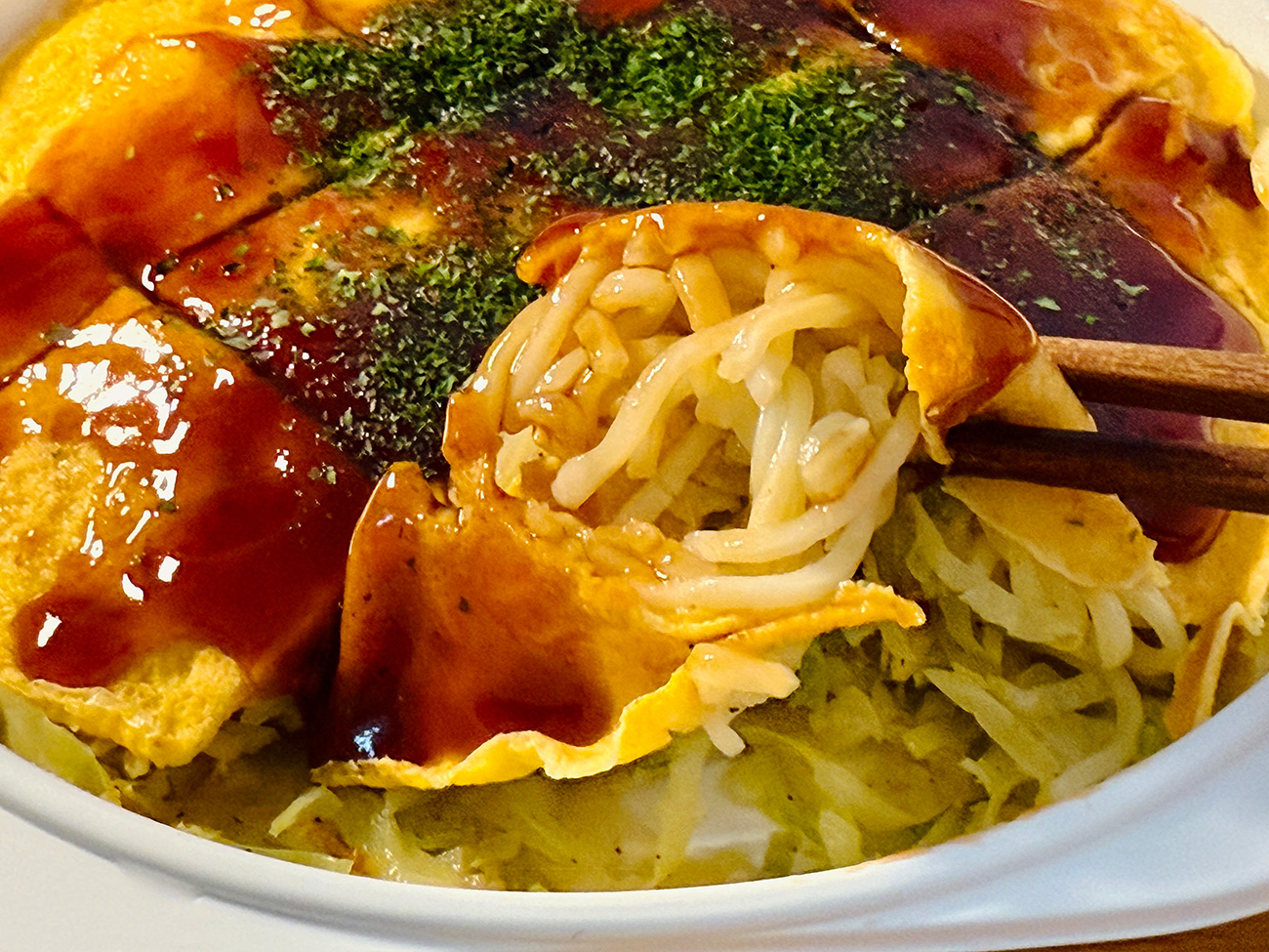 レンチンが終わったら「ヘラがあったら雰囲気出たんだけどな〜」なんて思いつつナイフで切れ目を入れ、付属のソースと青のりをかけたらできあがり。結構厚みがあって、ふわっと仕上がっているのが特徴的。これをいざ食べてみると、うわっ、間に挟まれた麺の存在感たるや……!