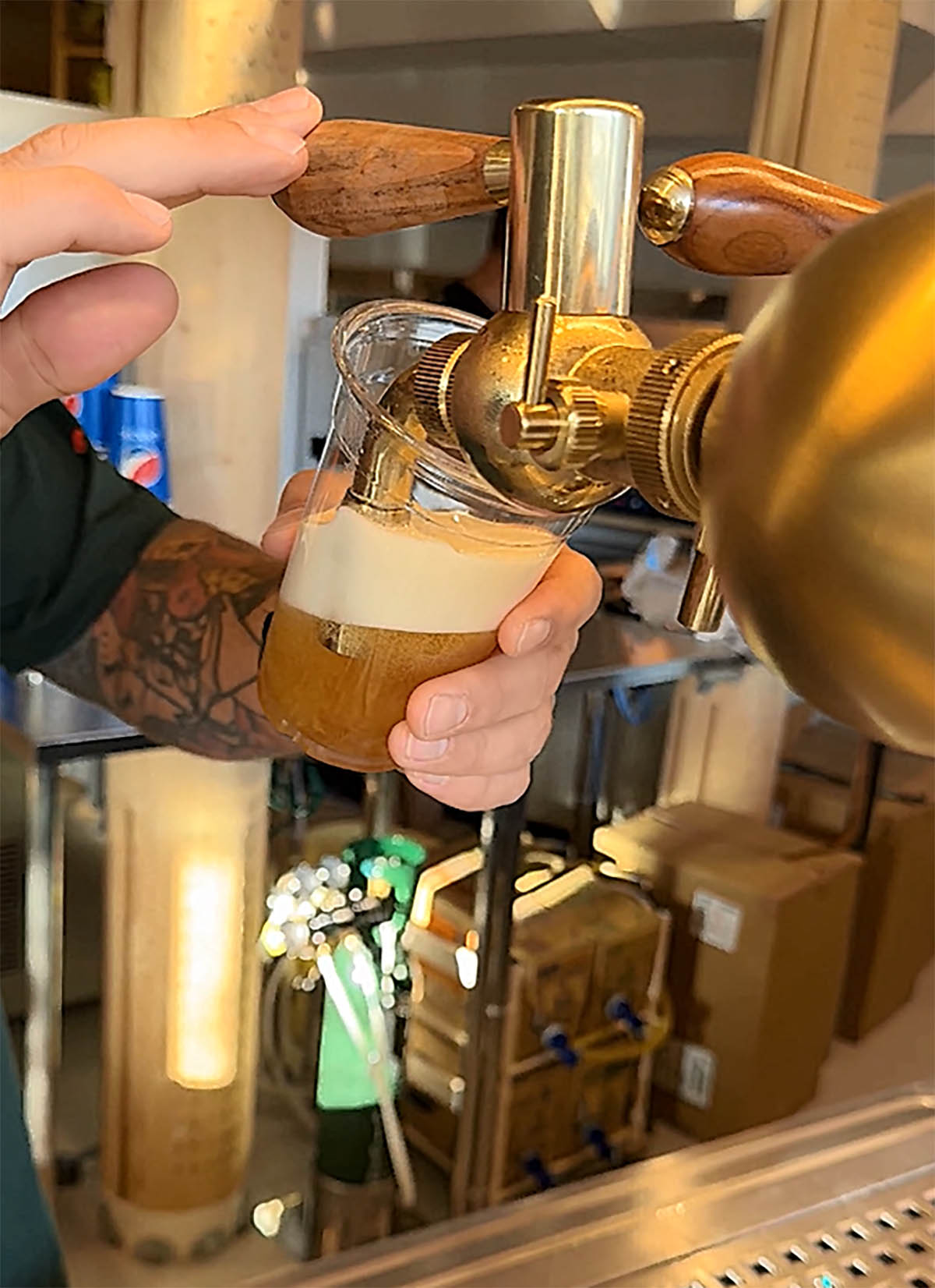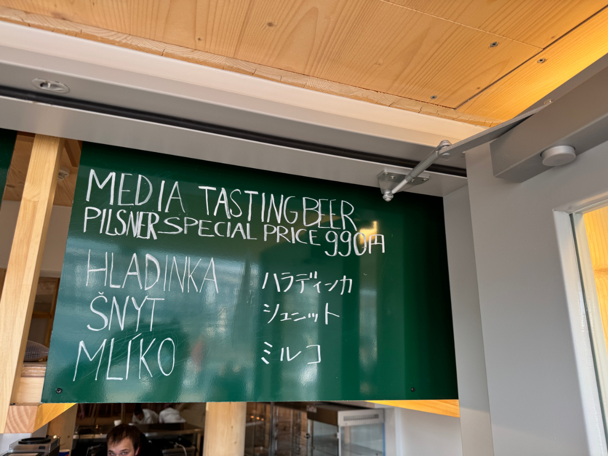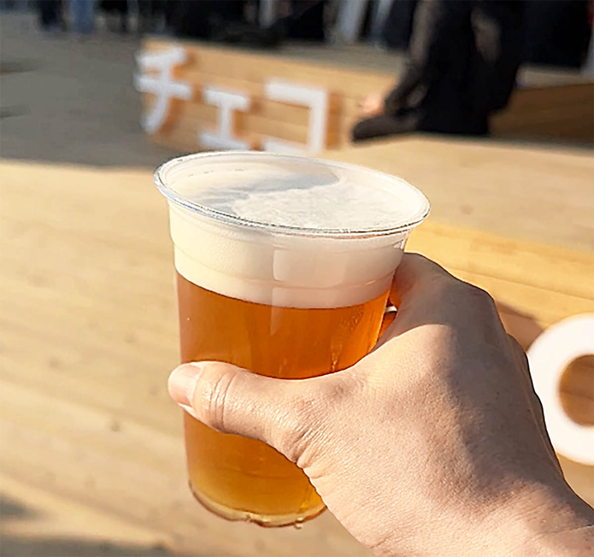 今回は野外で立ち飲みしたかったので、プラスチックのカップに注いでもらった。筆者が行った際はビールの種類はひとつだったが、注ぎ方は3つあり、「ハラディンカ」「シュニット」「ミルコ」それぞれ泡の量に違いがあるようだ。