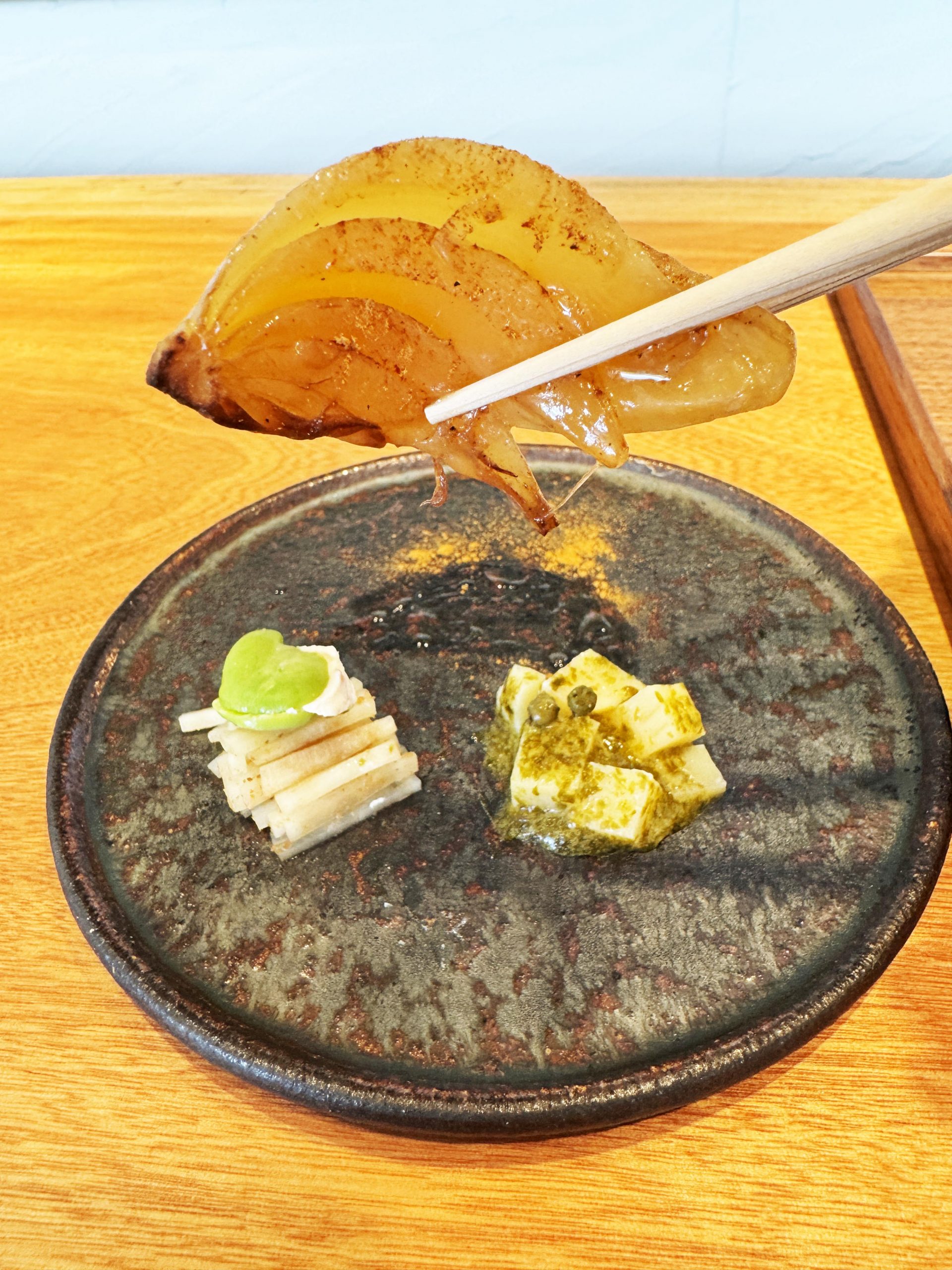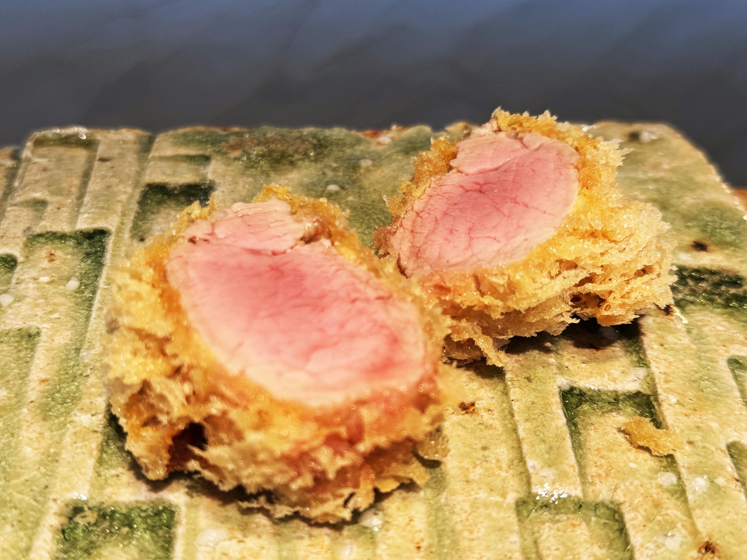 とんかつは、2貫ずつやってきました。揚げたてサクサクなのはもちろんのこと、食べると溢れる濃い旨味がステキです。