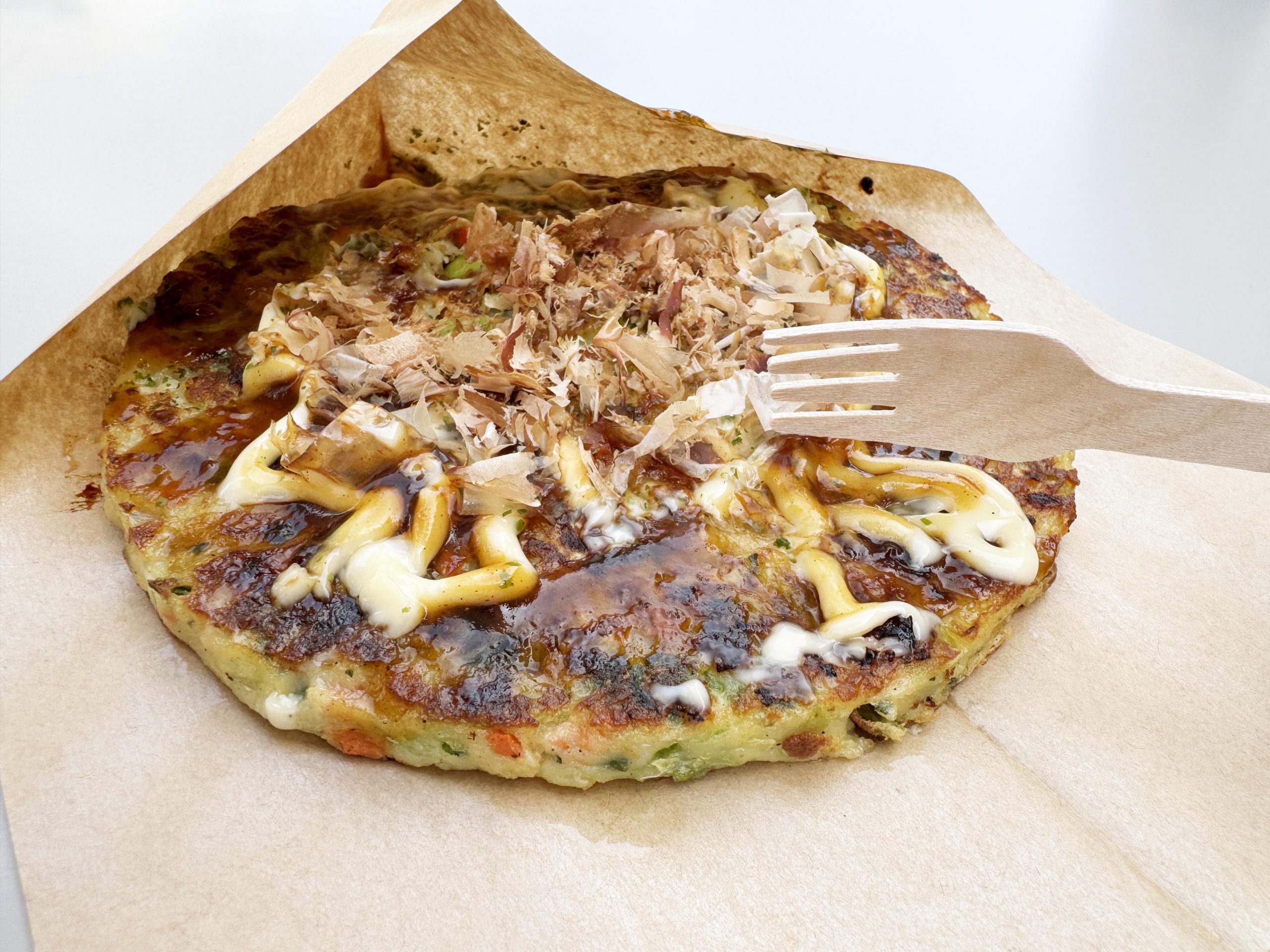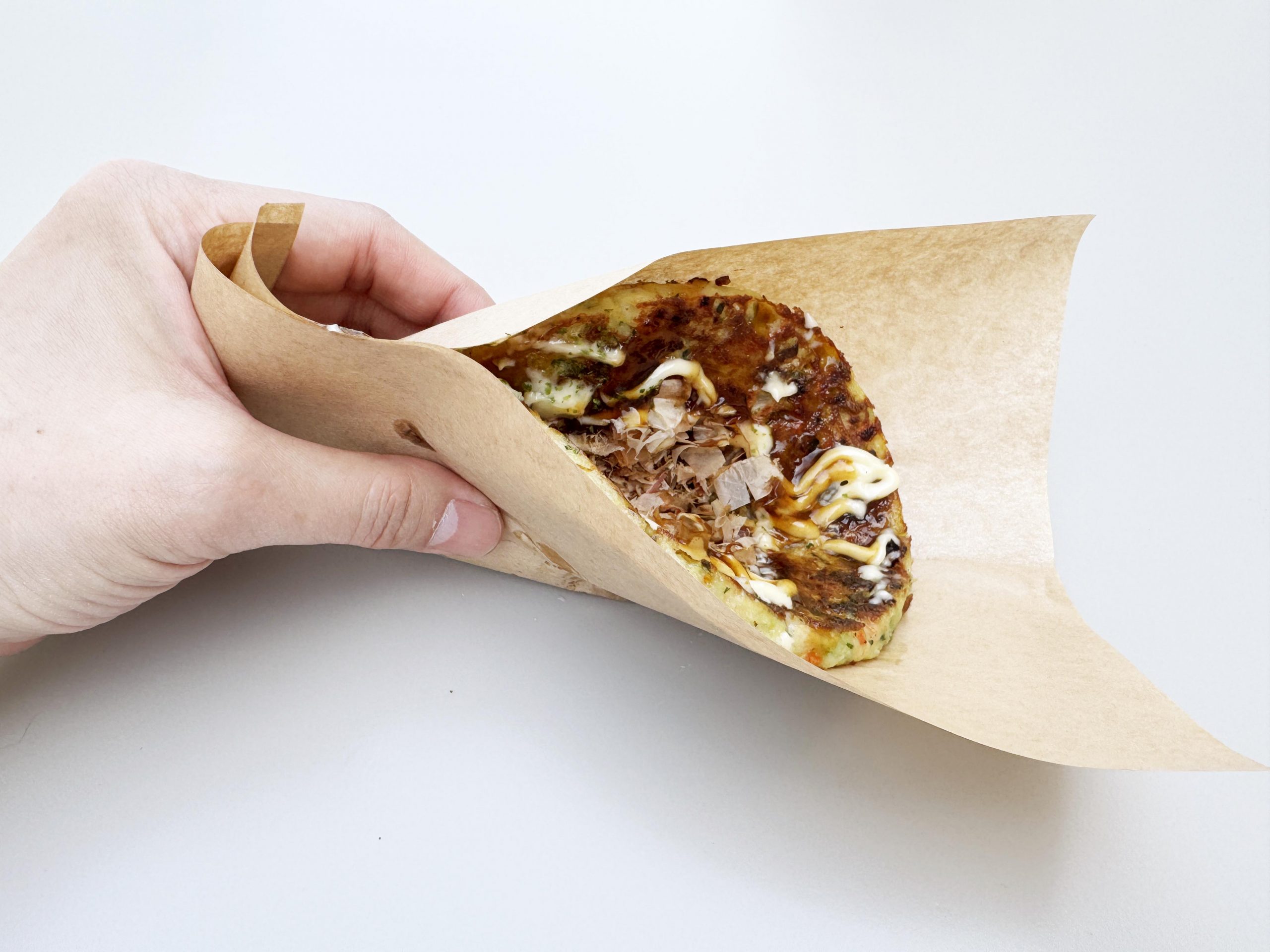 焼きたてのお好み焼きをシートに包んで持ち運び、そして食べる。木製のフォークも渡されるので、テーブルに置いてフォークで食べてもいいし、シートごと手に持ってかじりついてもいい。