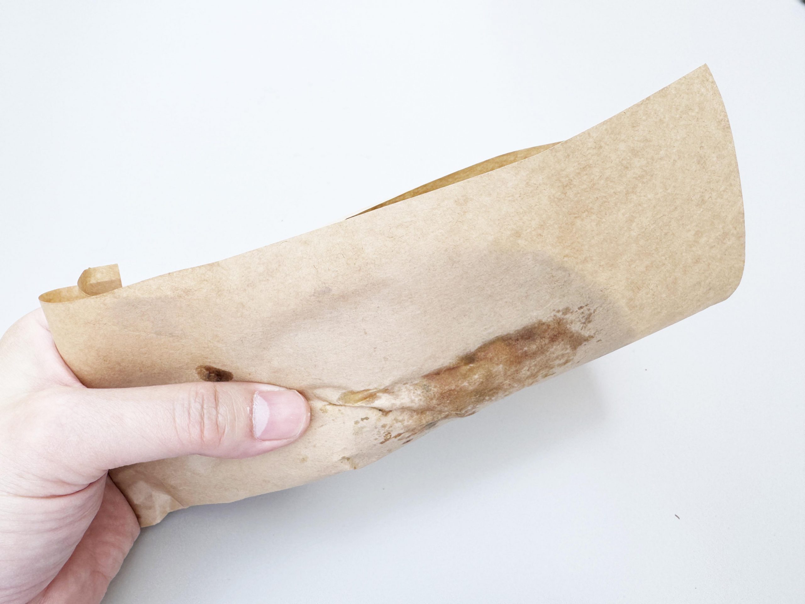 焼きたてだから熱々。お好み焼きに面したシート部分をつかむと熱いかもしれないので、シートの端をつまむように持つと熱くなく、持ち運びやすいよ。