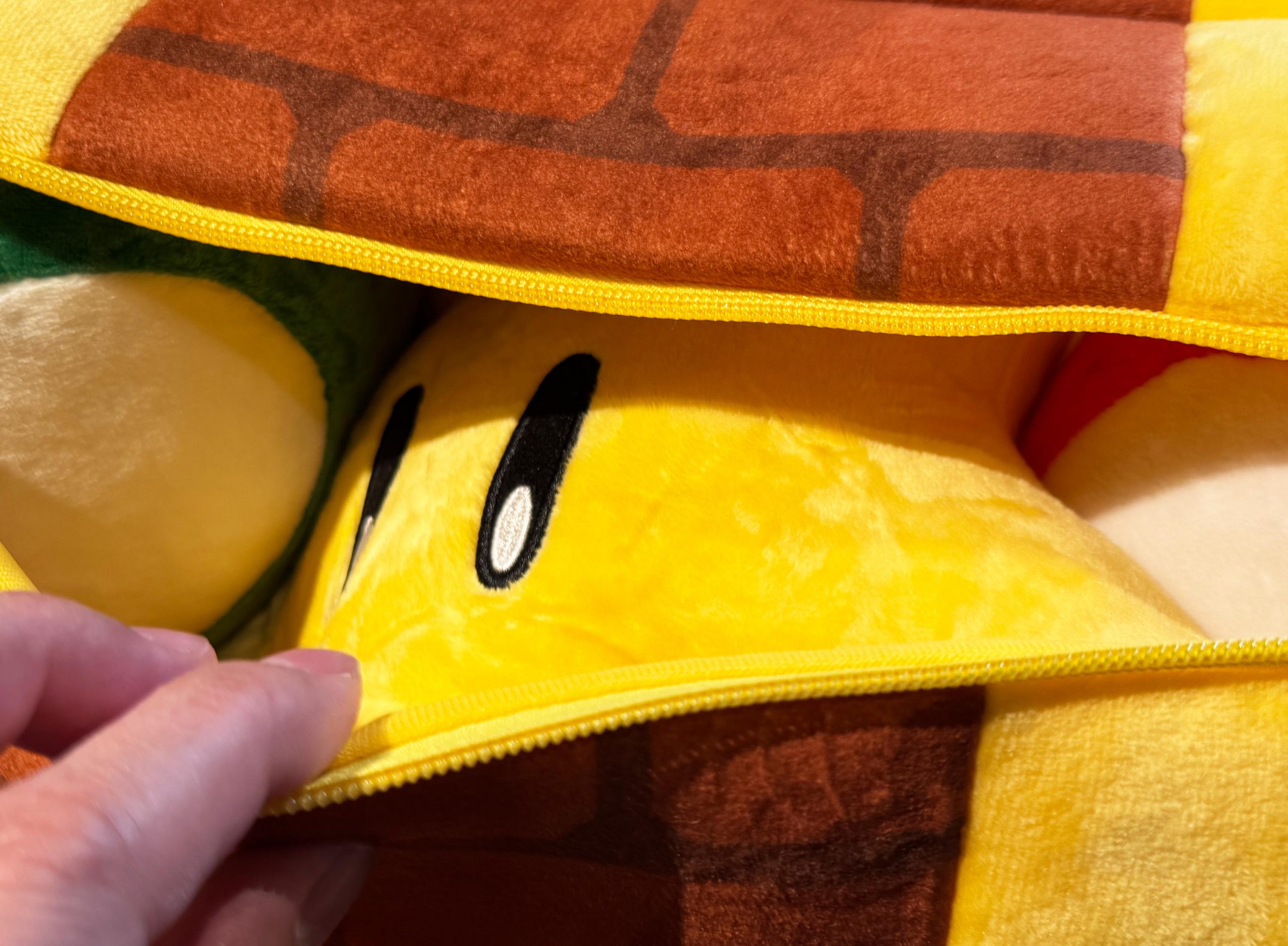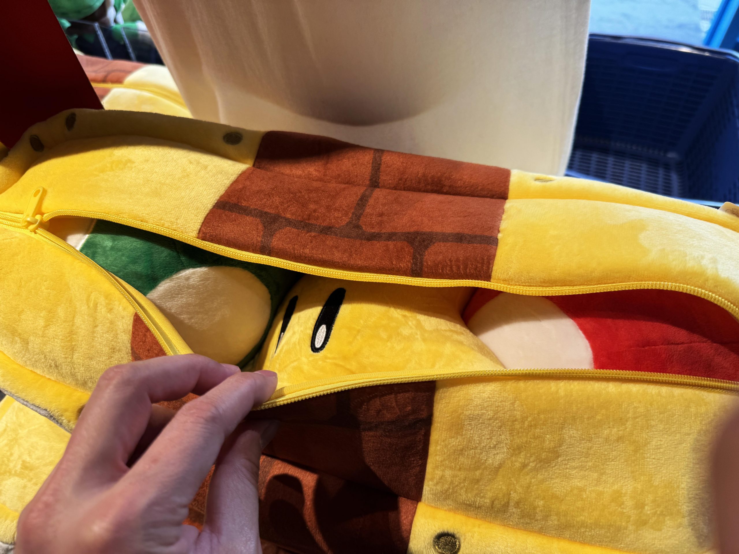 チャックがついていたので、中を見てみると、なんと、スーパーキノコや1UPキノコ、そしてスターが入っていた! そうです。ブロックの中にアイテムが隠されているという、ゲームのシチュエーションをクッションで表現しているのです。忠実すぎます! すごい!