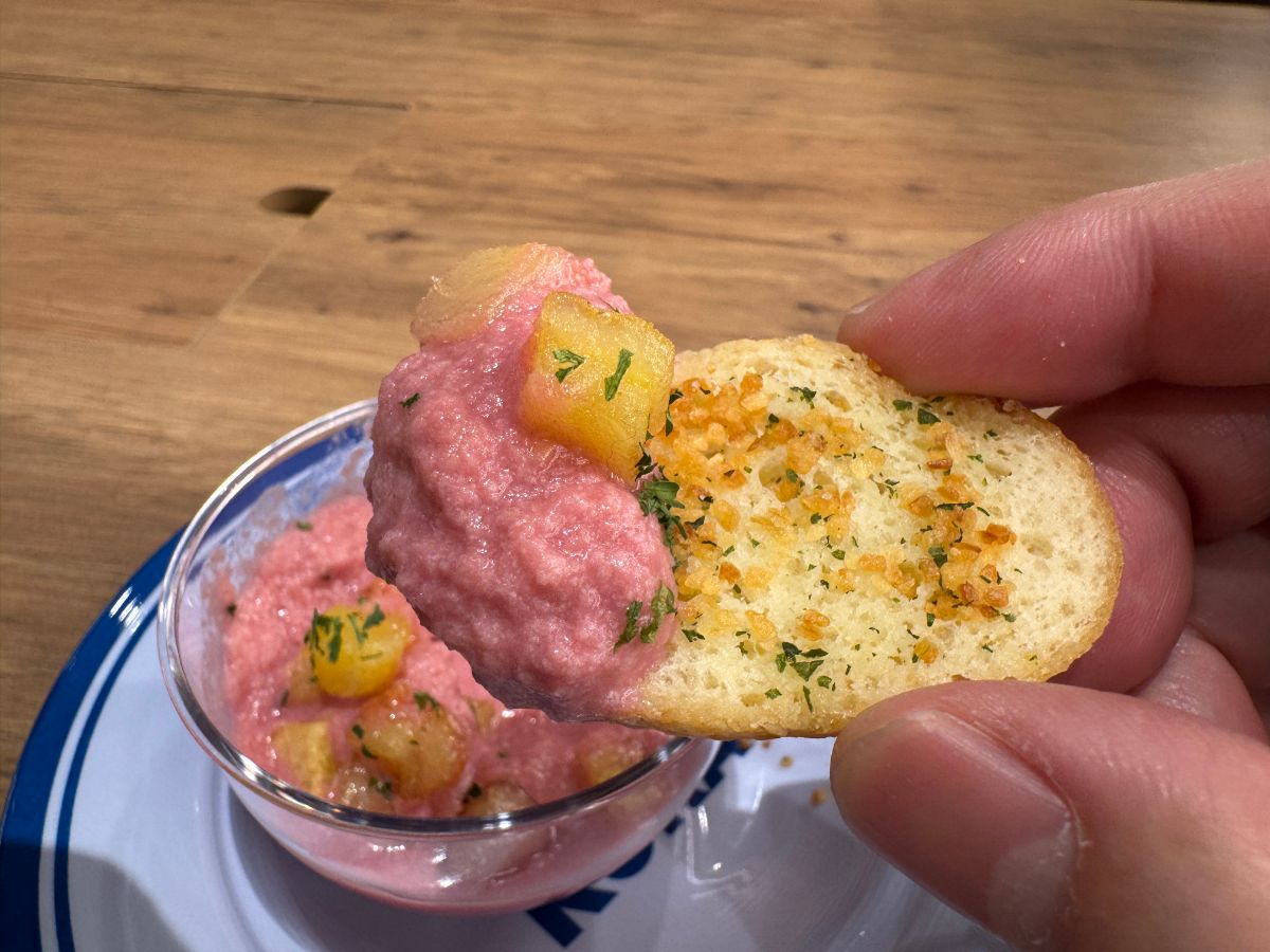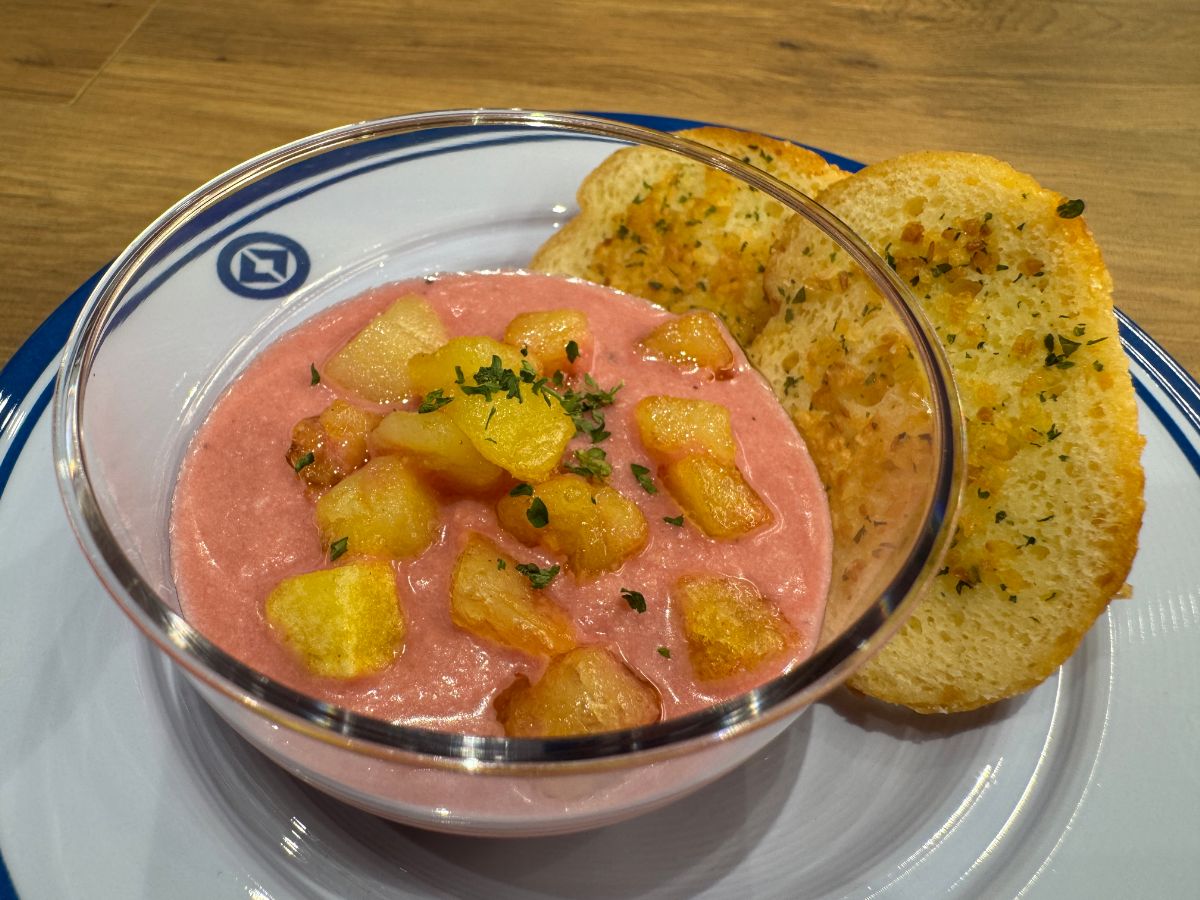 リトアニアの「シャルティバルシチャイ」は、極めて鮮やかなバイオレット色。ビジュアルもテイストも極めて上品。塩味よりも旨味を強く感じ、酸味がない状況でありながら、爽やかさを与えてくれる秀逸なもの。バケットの香ばしさも相まって素晴らしい一品。