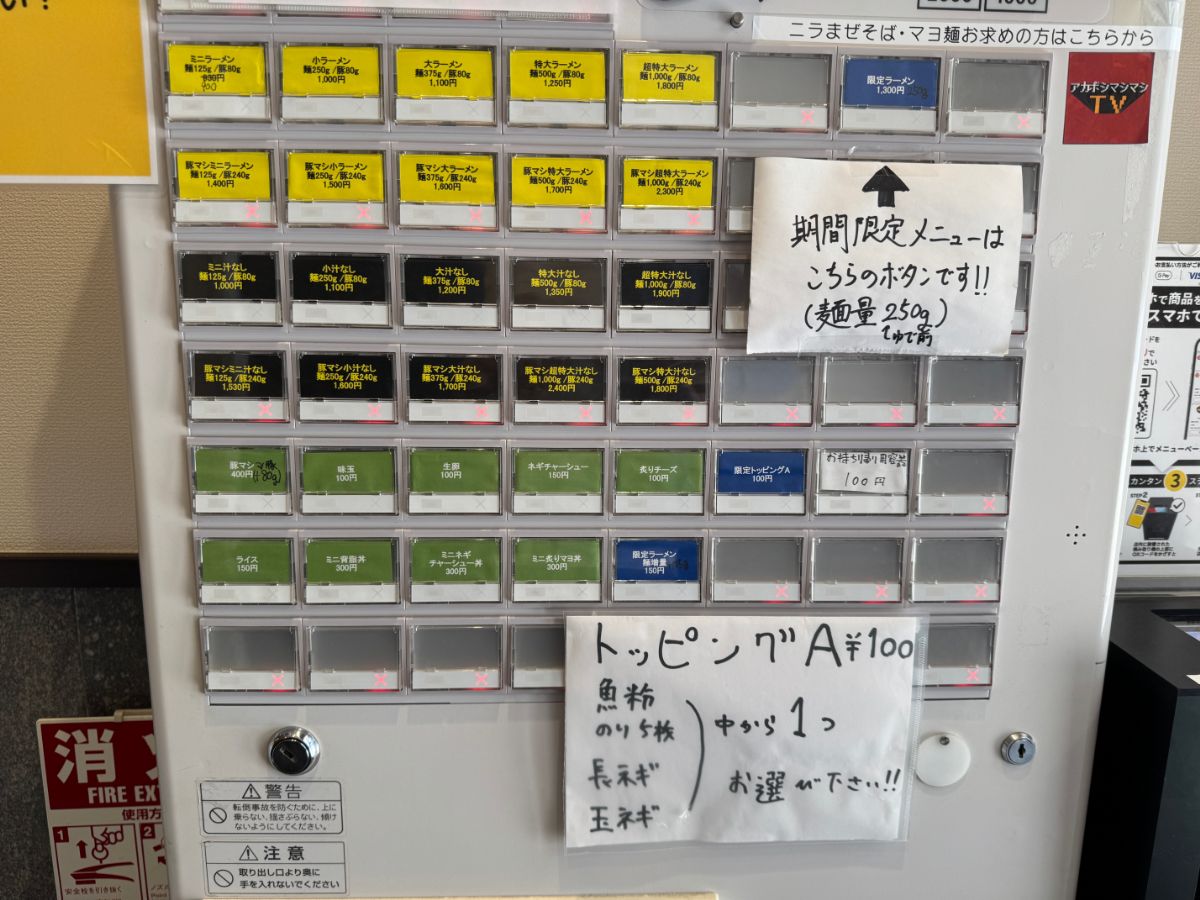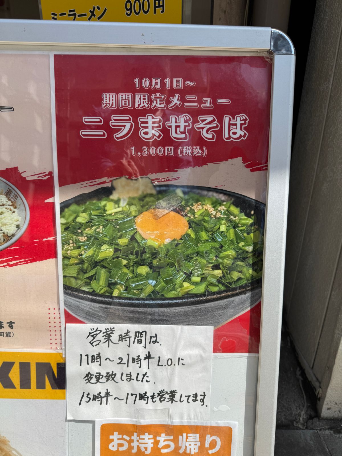 店舗に行ってみると、ラーメンのポスターが貼られていて、どれもおいしそうだったから、オーソドックスな定番のラーメン二郎系を食べたくなったけど、浮気せずに「ニラまぜそば」を食べることにしたよ。脳内がニラだらけになっていたから。