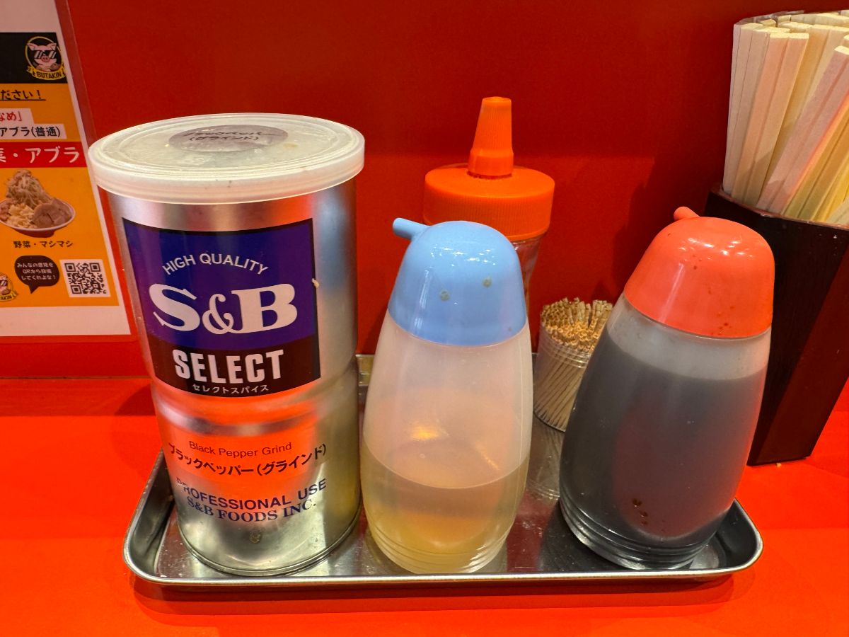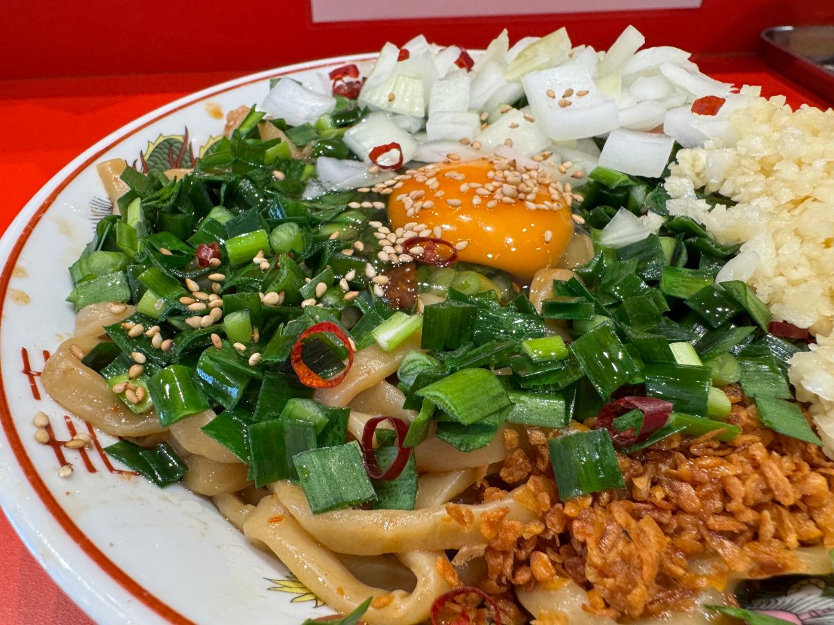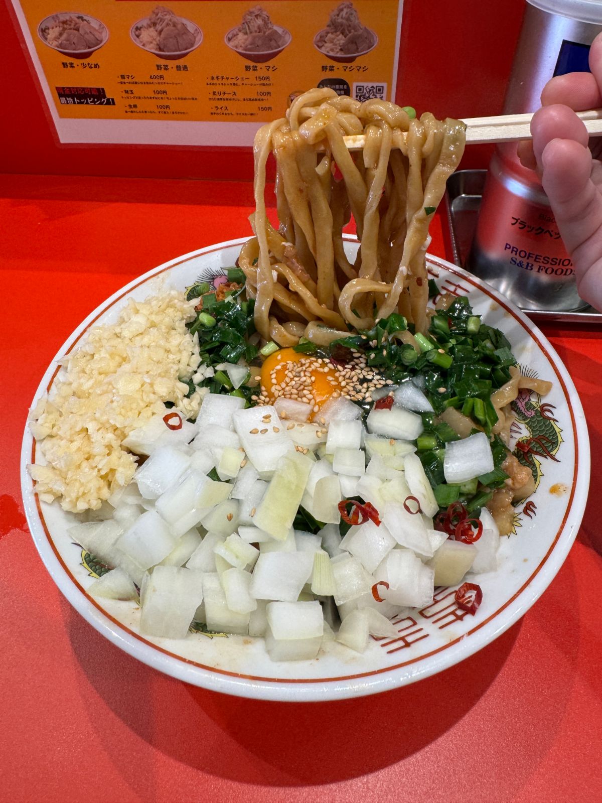 今回はニンニクマシマシのみ。デフォルトの「ニラまぜそば」の味をニンニクで楽しみたかったから。アブラマシマシにすると、麺がアブラでコーティングされすぎて本来の味がわからなくなるかも!? と思ったから。