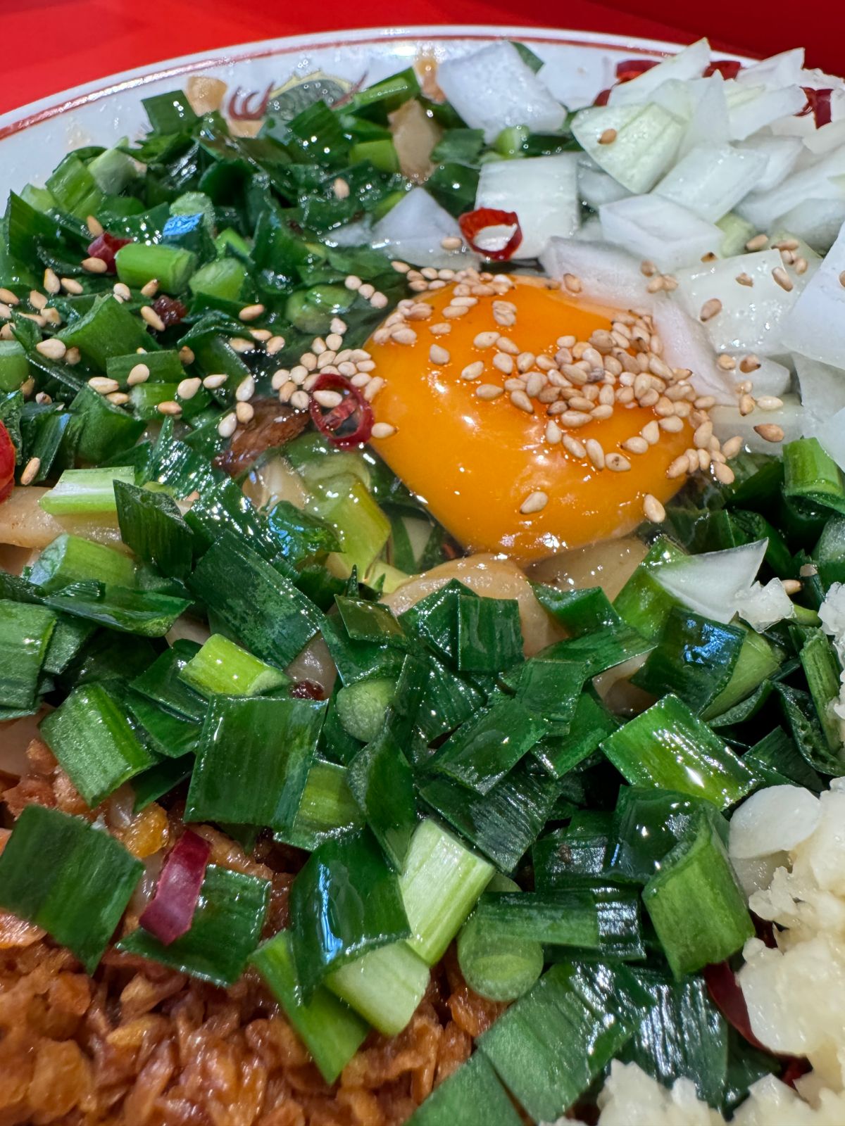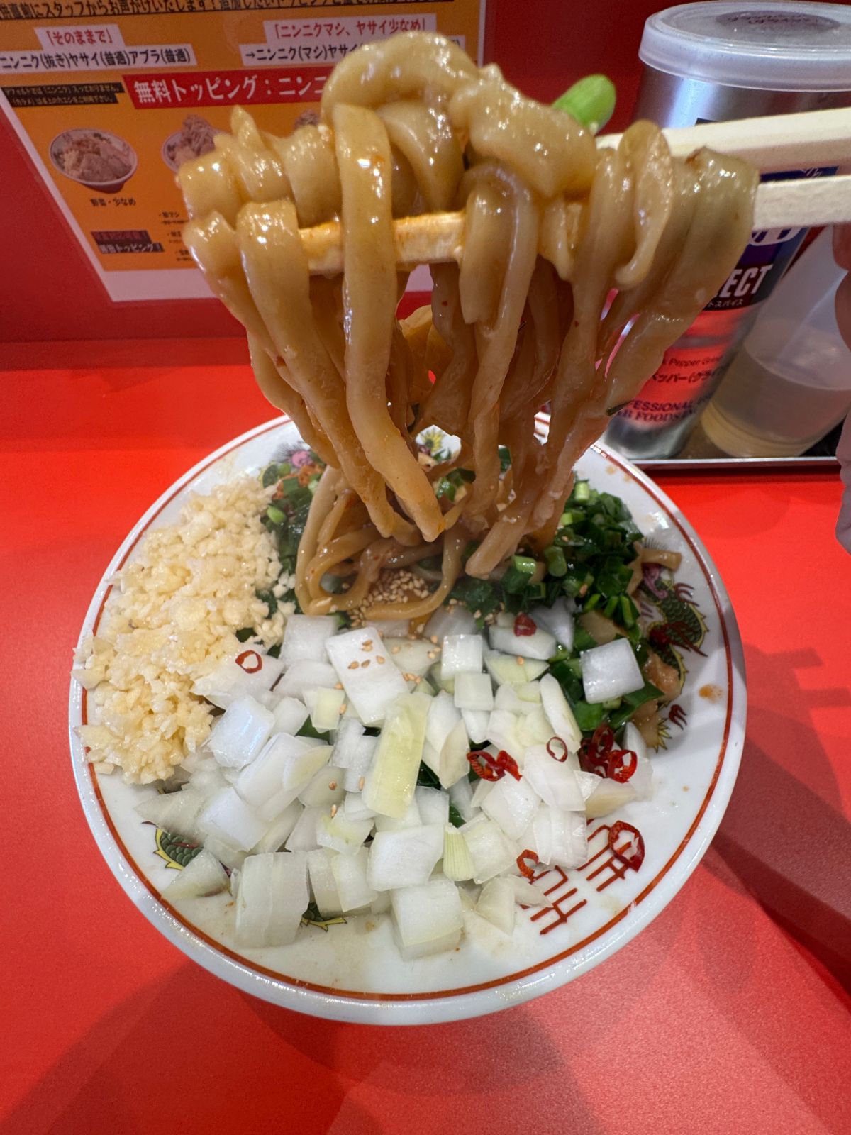 目の前にやってきた「ニラまぜそば」は、思っていた以上にニラニラニラニラニラニラで、ニラ好きにとってご褒美ともいえるニラっぷり。そこに大量のニンニク。つまりどちらも同じネギ属ということで相性バッチリなはず。いま思えば、長ネギもトッピングすれば良かったかも。