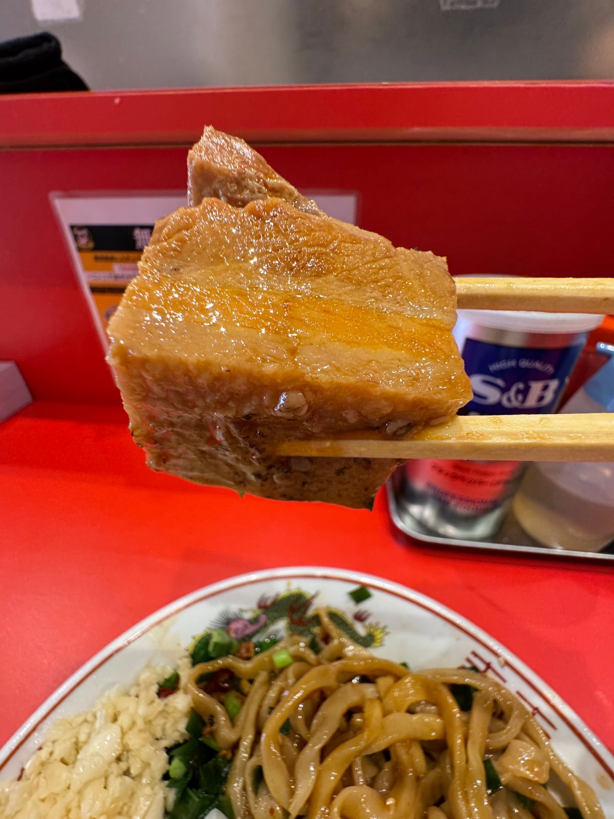 豚はスライスではなく、角煮のようなブロックだったよ。かなり大きい。一口では食べにくいけど、一口でも食べられるギリギリサイズを、二口で食べる。