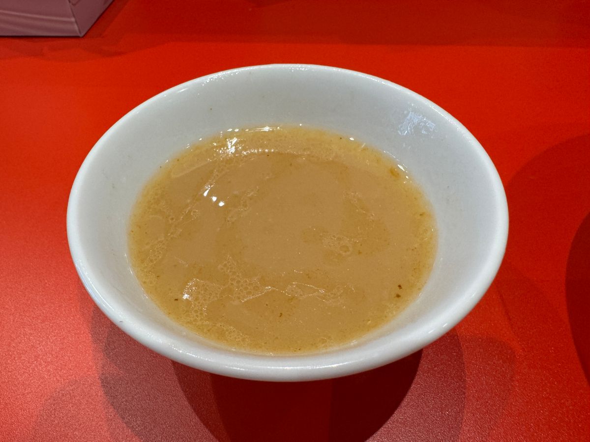 今回はスープそのものの味を知りたかったので、丼ではなく小さな器に入れてもらったよ。それをためしにすすってみる。……熱い! そして、限りなく優しくて、うまい!! 出汁だけでもうまいものだなあ。「ニラまぜそば」が濃いので、このスープは一緒に飲むものとして最適かも。