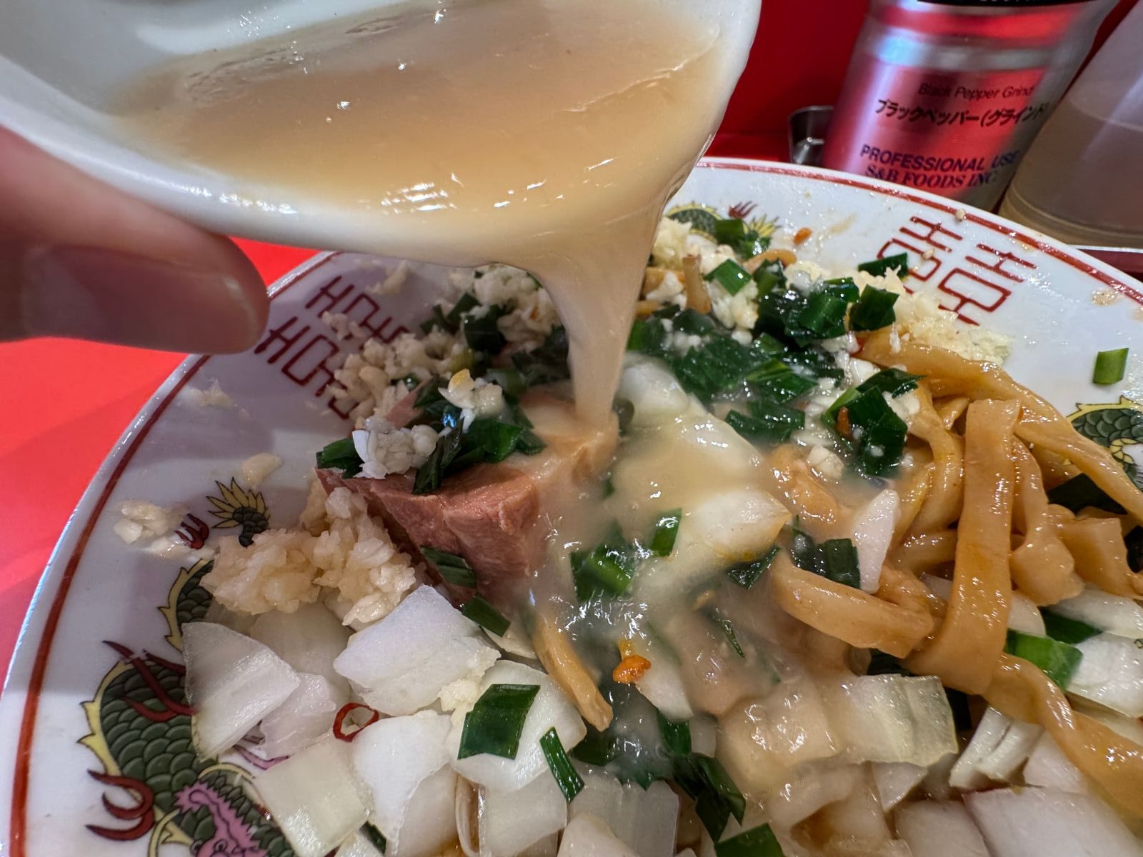 「ニラまぜそば」はスープ割りが可能だよ。スープを丼に注いでもらう感じ。自分が好きなタイミングで注いでもらえるので、半分くらい麺や具が残っている状態でスープを注いでもらえば、ラーメンのように食べられるよ。
