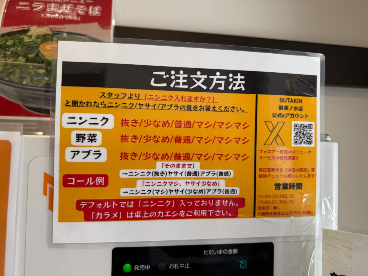 今回は「ニラまぜそば」とタマネギの食券を購入。着席して、店員さんに食券を渡す流れ。無料トッピングの増減は、このタイミングで伝えるよ。