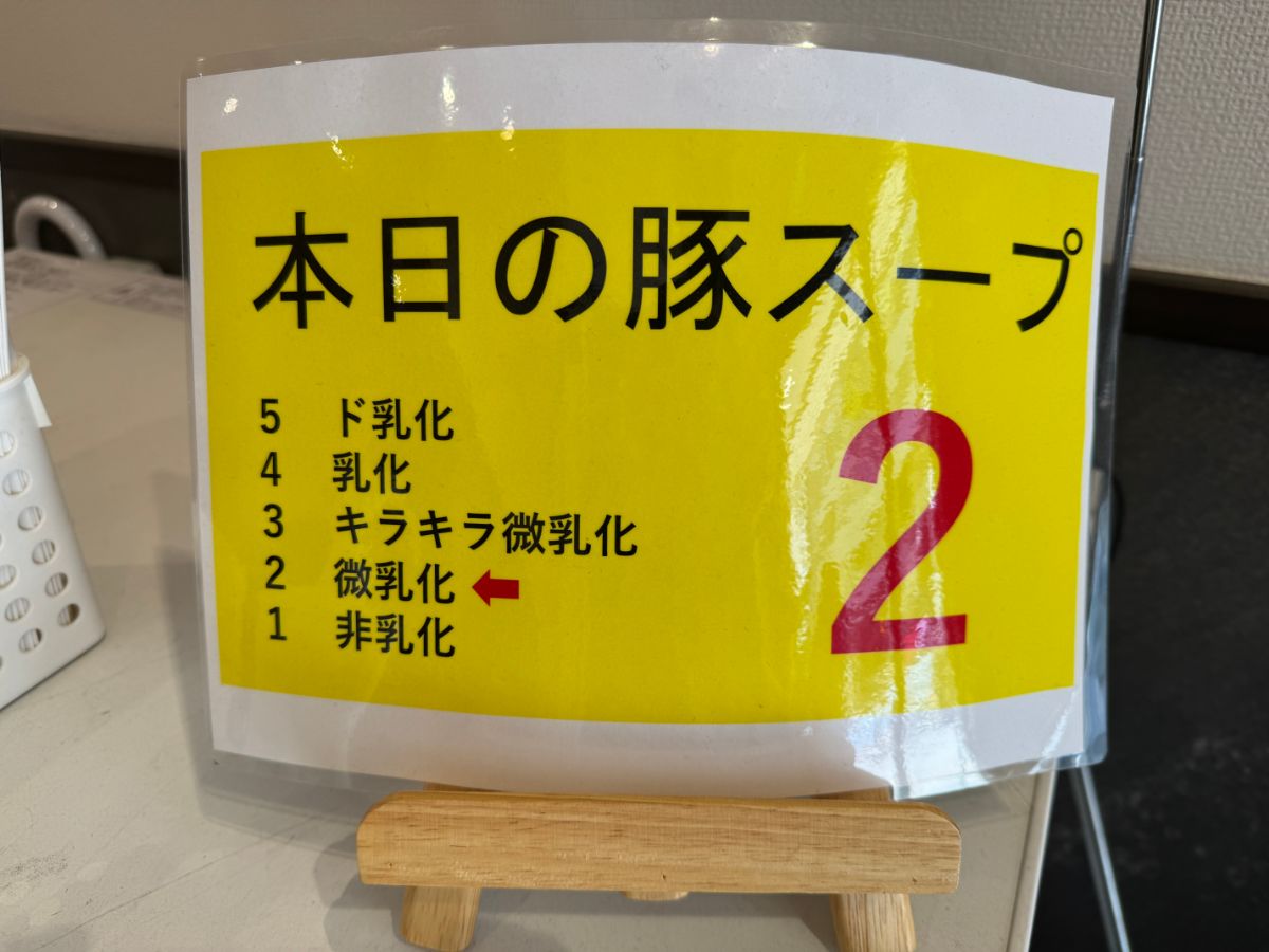 なんか、今日のスープの状態がわかるようになっていたよ。店内に「本日の豚スープ」と書かれたプレートがあって、そこに「ド乳化」「乳化」「キラキラ微乳化」「微乳化」「非乳化」の項目があって、今日は「微乳化」だったよ。