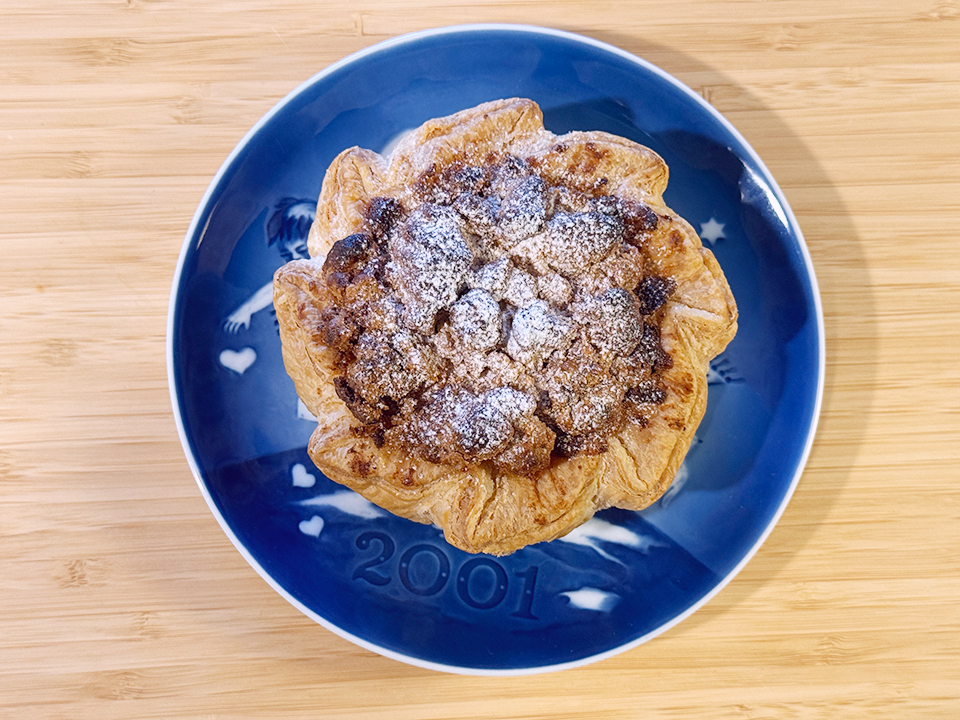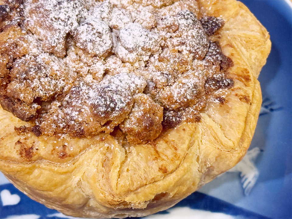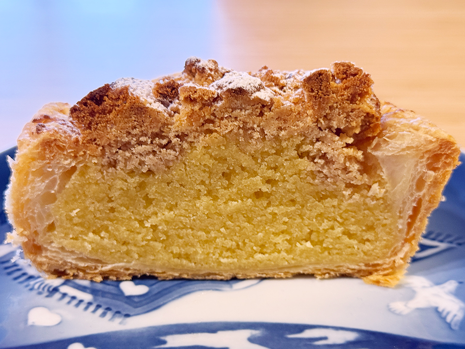 パイはたっぷりと空気を含んでさっくりとして、クレム・ダマンドの表面はそぼろ状のクランブル、内側はしっとりとした湿度があり口の中でとろける柔らかさ。