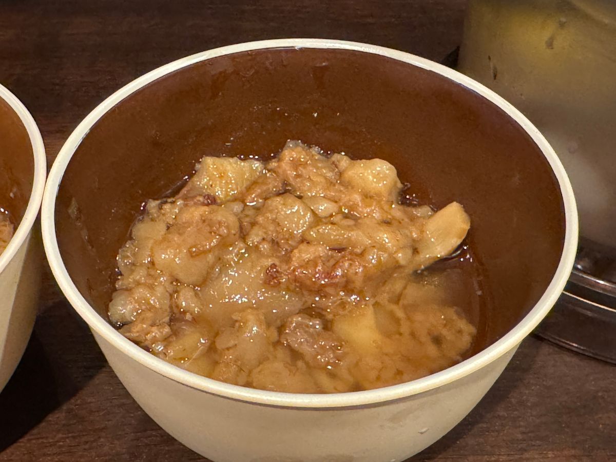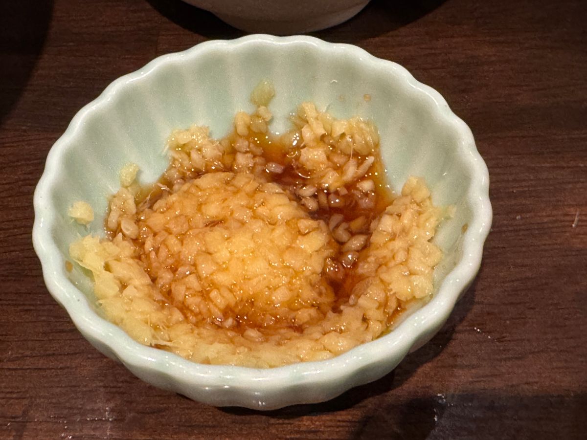 あぶら増し、あぶら入りめんま、しょうがダレ、生玉子は別皿でやってくる。あぶらは液体とクニュとしたプルプル状のものがたっぷり。ラーメンにかけたときにヤサイに染み込む仕様になっているのが嬉しい。