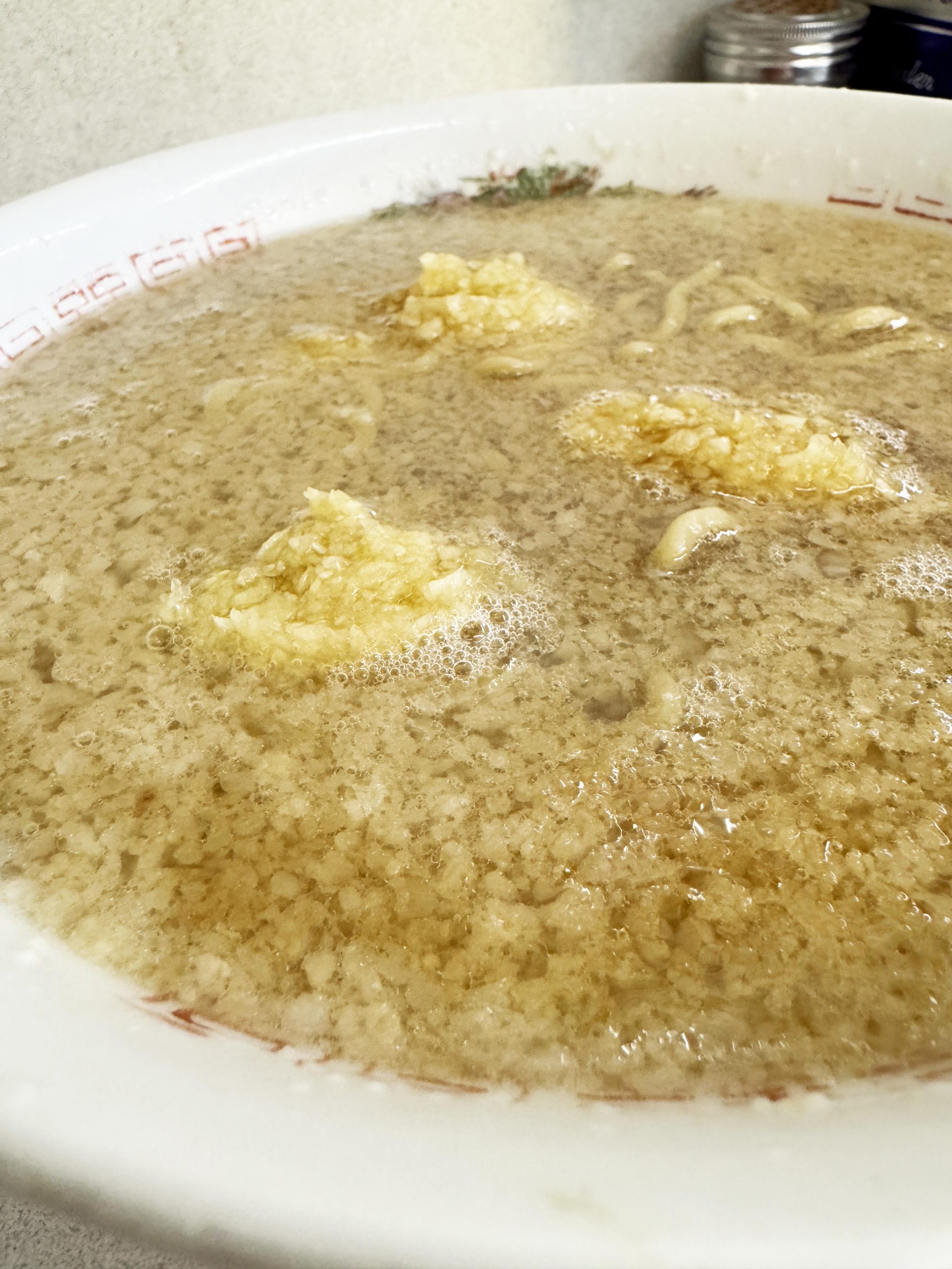 ……だがしかし! もっともっと、ラーメン神田店を追求したい。ということで、今回は具ナシラーメン+ニンニクマシマシを食べてみたのだが、これもまた最高の一杯となった。