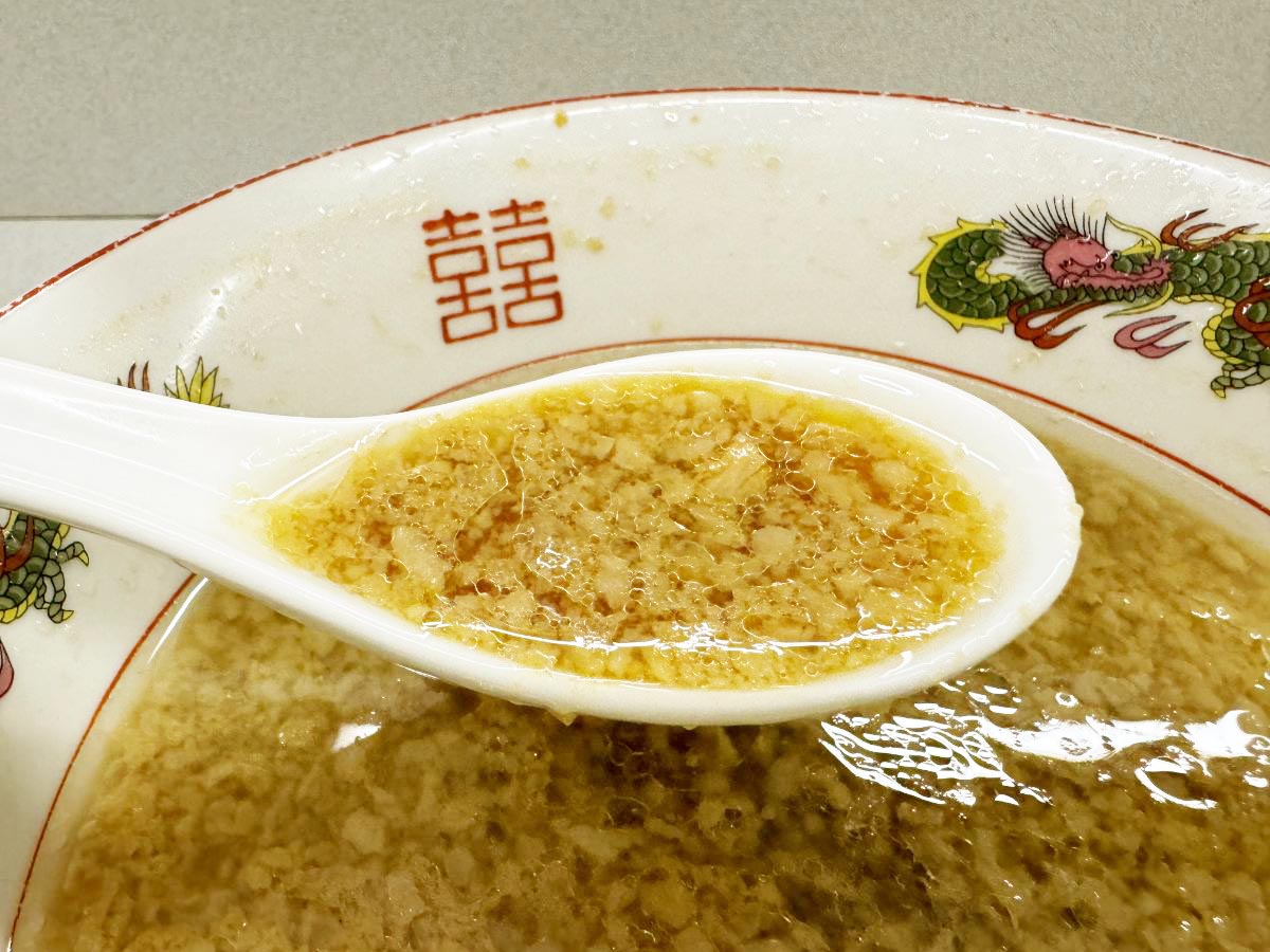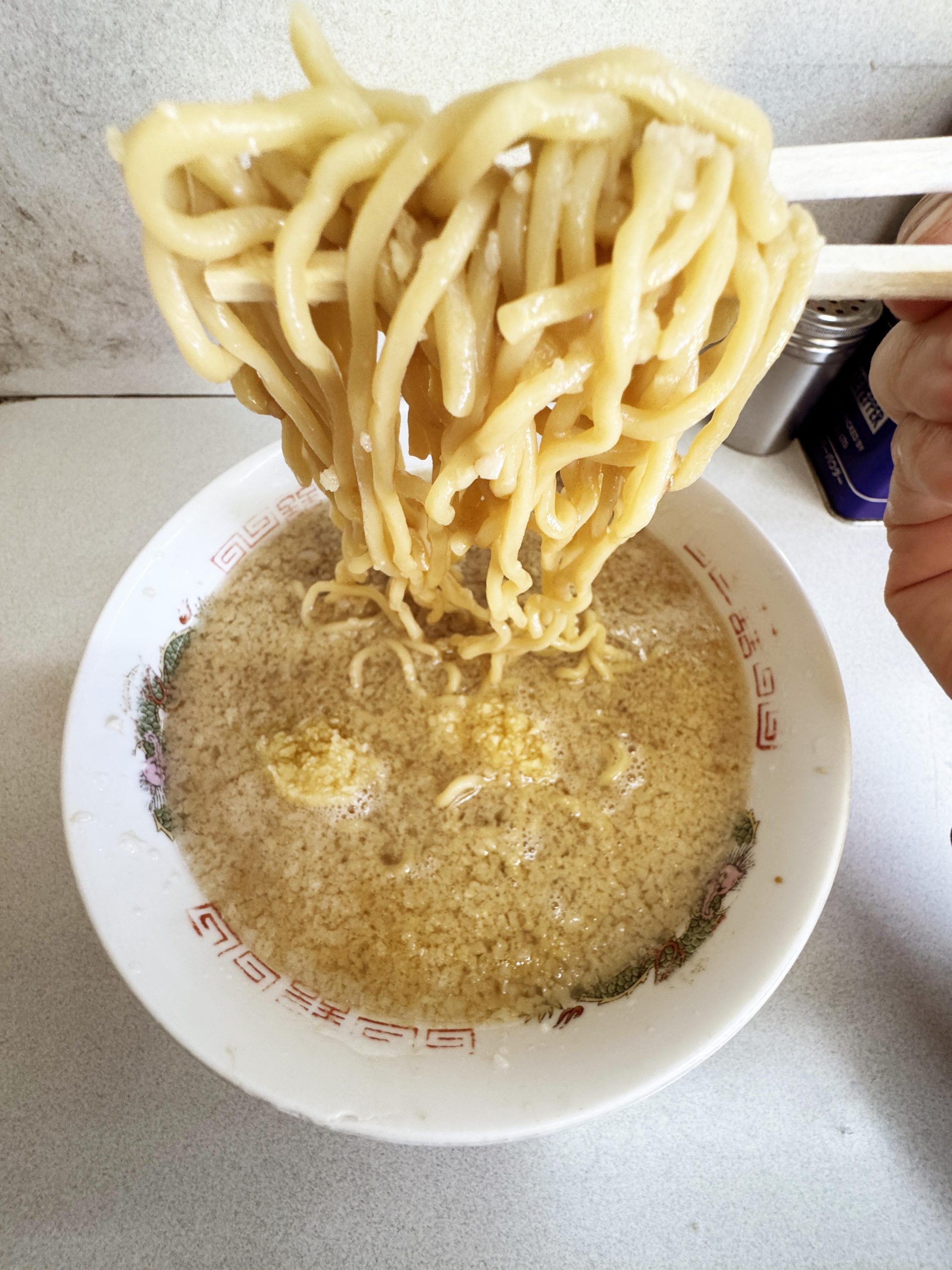 あえてニンニクは混ぜずに、盛られたままの状態を保つ。麺をすすると、じょじょにニンニクが拡散されていき、麺に吸着。