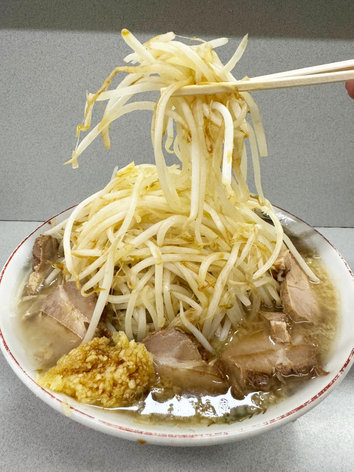 上のラーメン画像はヤサイアブラニンニクマシマシなのだが、このスープは麺だけでなくヤサイすら至高のものに昇華。ヤサイからあふれるピュアな甘味を爽やかなのにコッテリスープが包み込み、唯一無二の甘味に。タマラナイ。