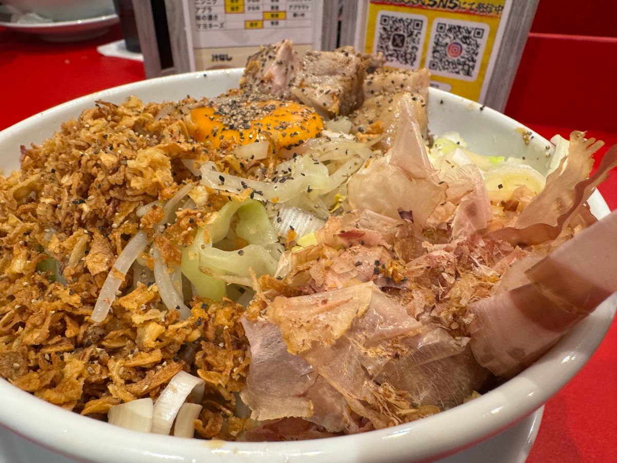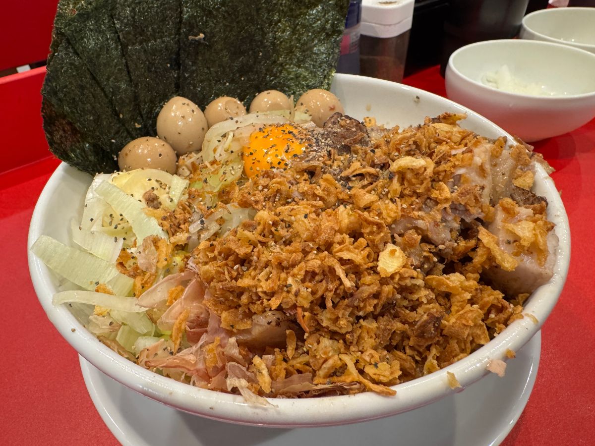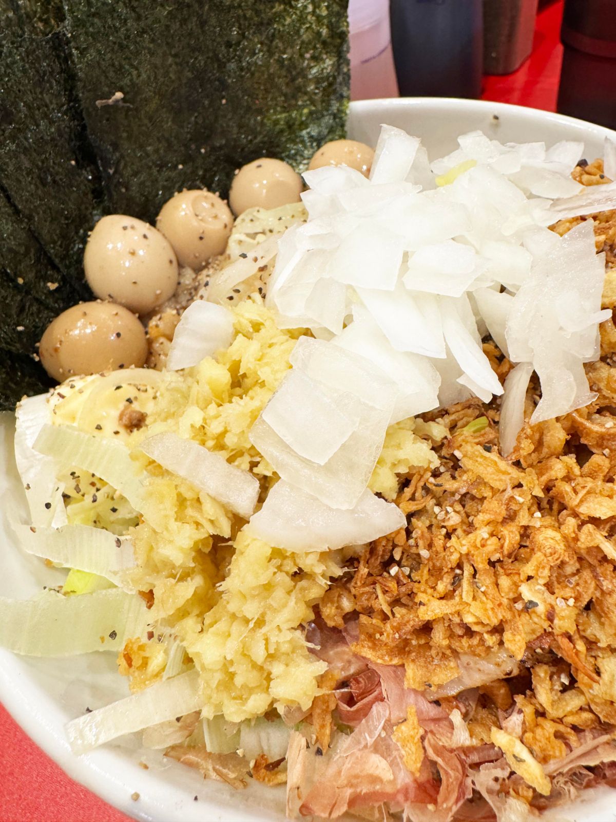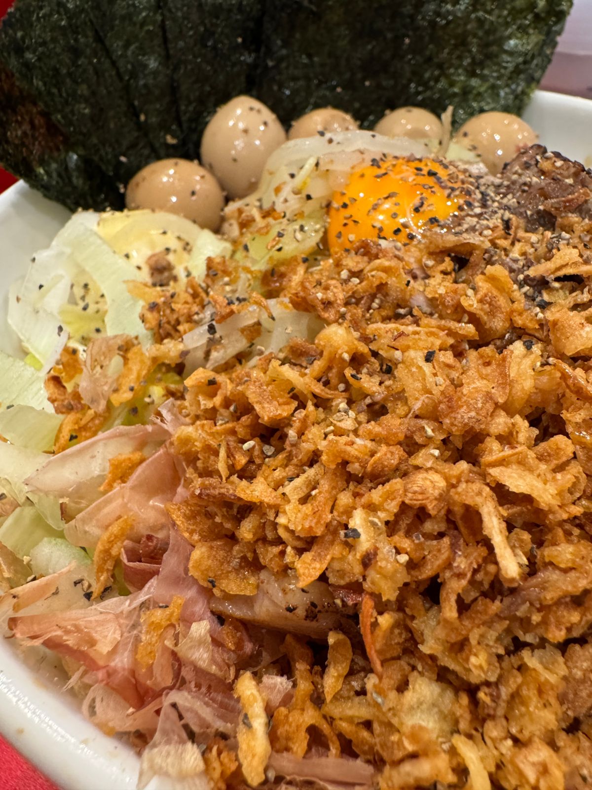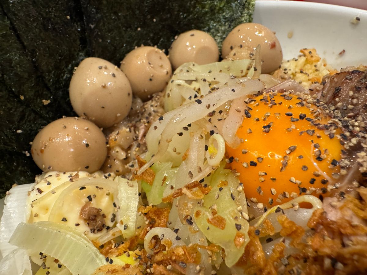 今回オーダーした麺は「特製汁なし+ニンニクマシ」にタマネギとショウガを有料トッピングして食べたよ。すごいボリュームのやつだよ。っていうか、うずらが凄い!! うずら量がスゴイ!! うずらがデフォで5個も入ってる!! 食べてみた!! こっ!! 濃いーッ!! 濃い!! パワフル!!