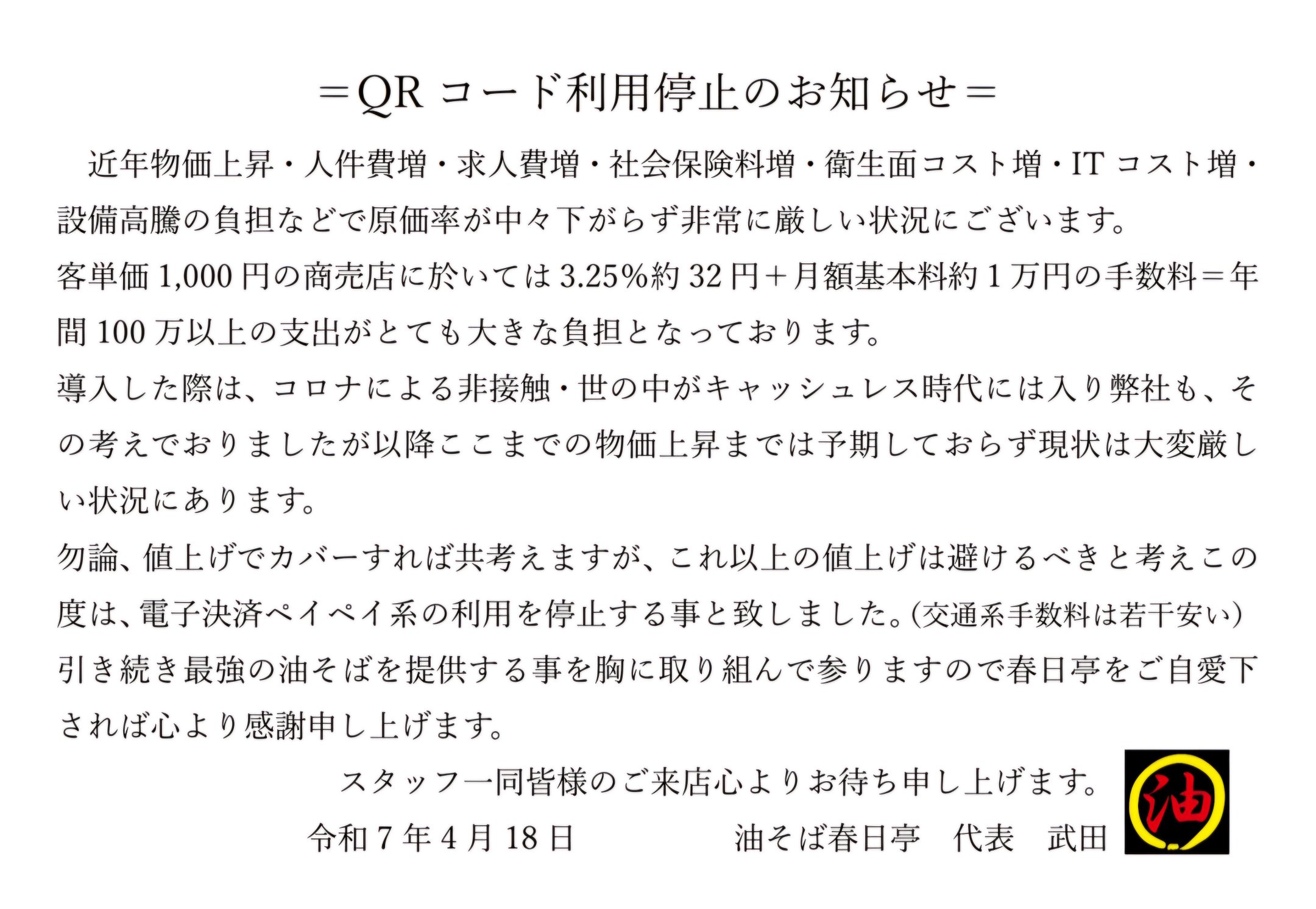 お客様にはご不便をお掛けしますが極力現金でのご利用をお願い申し上げます。 pic.twitter.com/VzyRSPl8LY— 油そば春日亭@公式ツイッター (@kasugatei) April 18, 2025