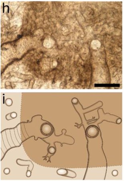 【▲図2:分析された化石の拡大写真 (h) と、その構造を表した模式図 (i) 。スケールバーは0.05mm。非常に細かい管が複雑に枝分かれしており、その構造は現代のどの真菌にも見られないものだったよ! (Image Credit: Corentin C. Loron, et al. / プレプリントFig.2よりトリミング) 】