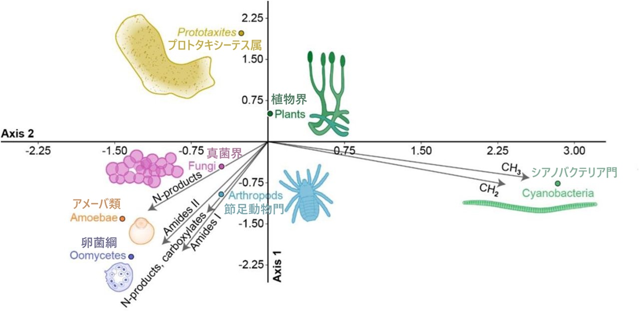 【▲図3:化石に含まれる物質がどの程度似ているかでグラフに置いてみると、プロトタキシーテスはよく知られているどの真核生物とも離れた位置に置かれていることが分かるよね。これらの証拠から、プロトタキシーテスは真菌ではないだけでなく、どの生物とも界レベルで離れていると考えることができるよ! (Image Credit: Corentin C. Loron, et al. / 日本語訳は筆者 (彩恵りり) による) 】