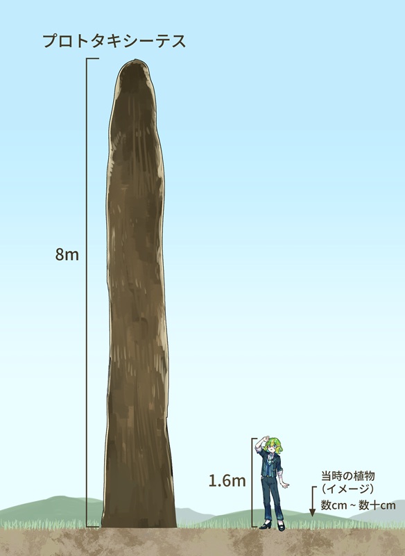 【▲図1:プロトタキシーテスは高さ8mという非常に巨大な生物で、4億年前では間違いなく最大の陸上生物の1つだったよ。 (Image Credit: 島宮七月) 】