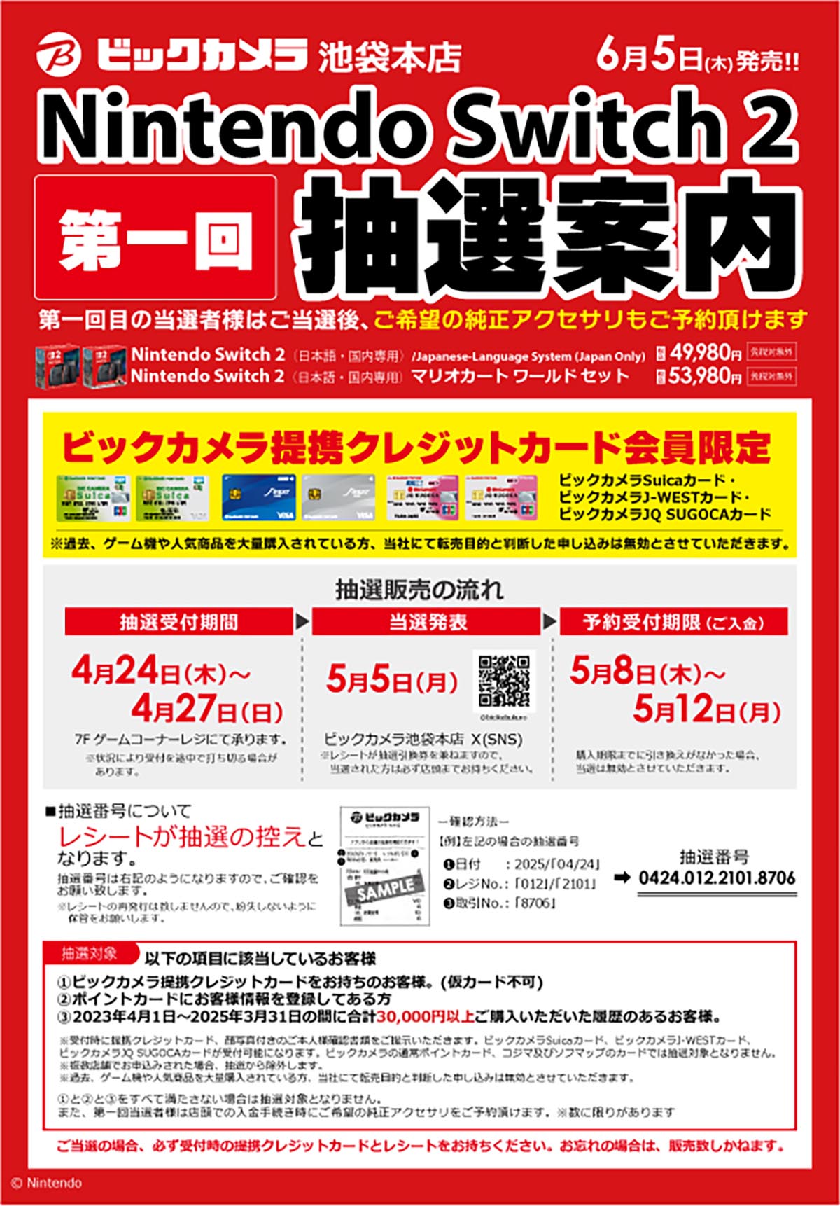 ビックカメラ店舗のNintendo Switch 2の抽選販売に参加するには、ビックカメラ提携クレジットカードを所持しており、ビックカメラポイントカードにお客様情報を登録済みで、さらに2023年1月1日~2025年3月31日までに合計30000円以上の購入履歴がある必要があるという。