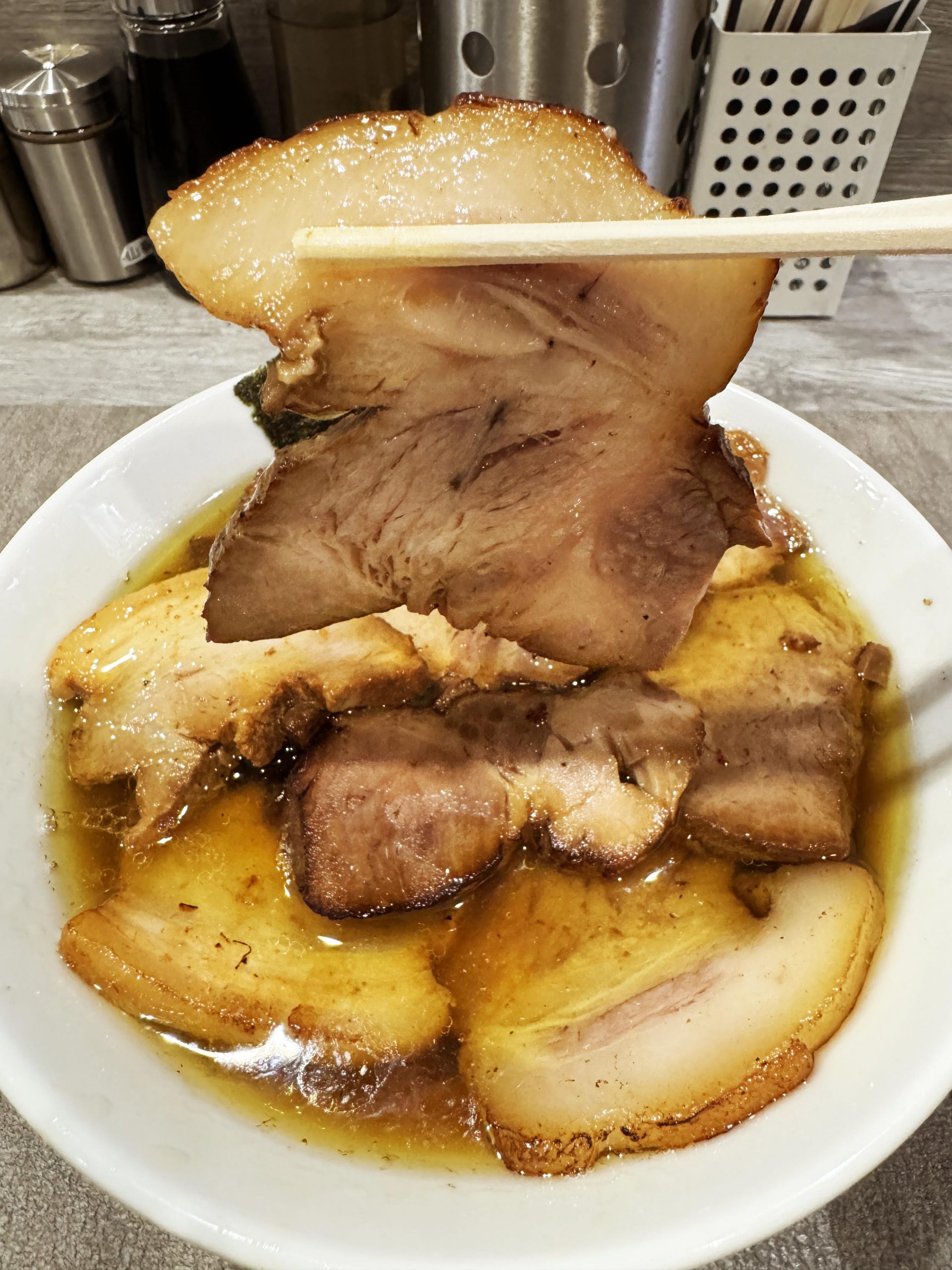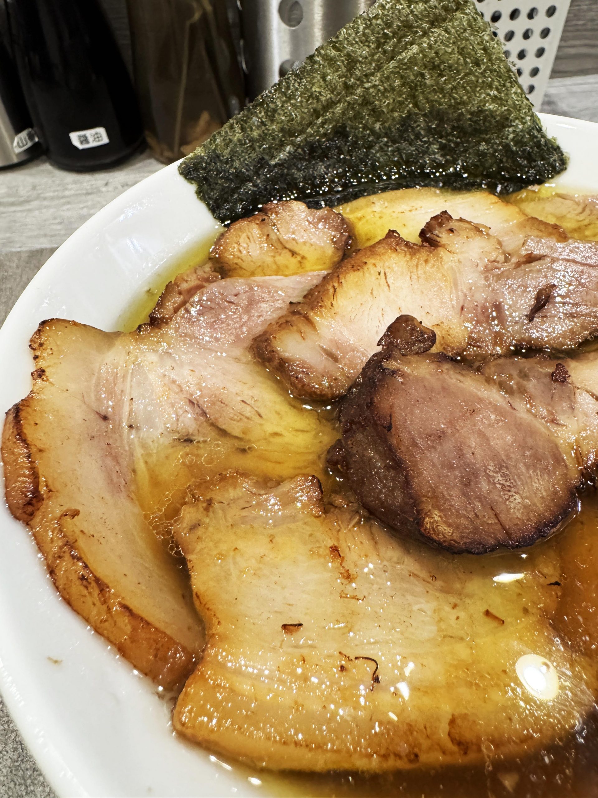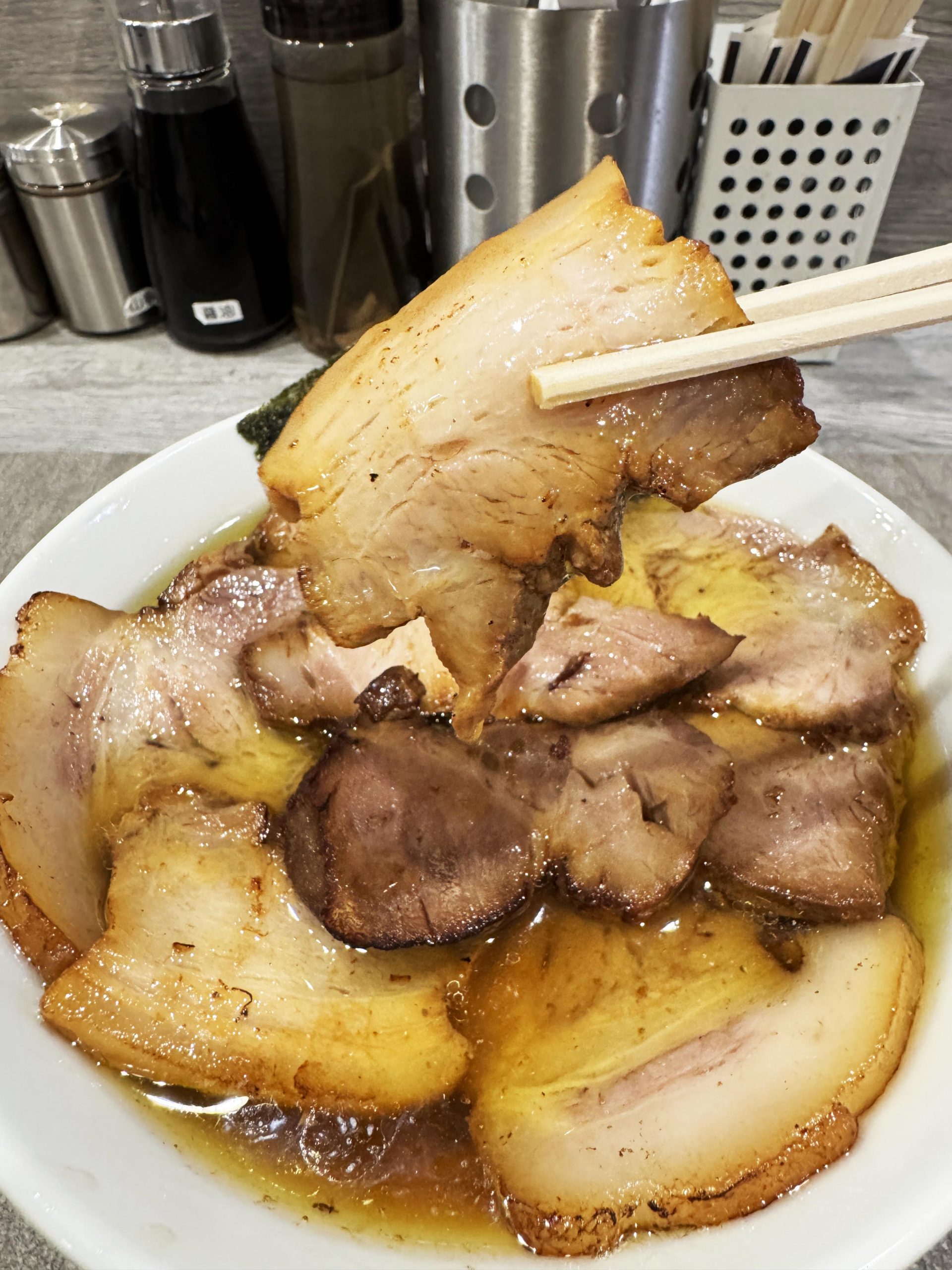 目の前にやってきたチャーシュー麺+炙りチャーシューは、まさにチャーシュー好きにとって神域レベルのビジュアルと薫り。極めておいしそうな香ばしさ。薫り高いチャーシューたまらない!
