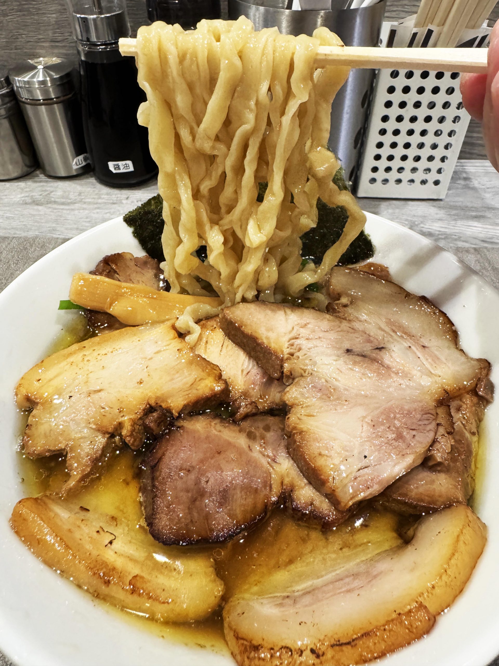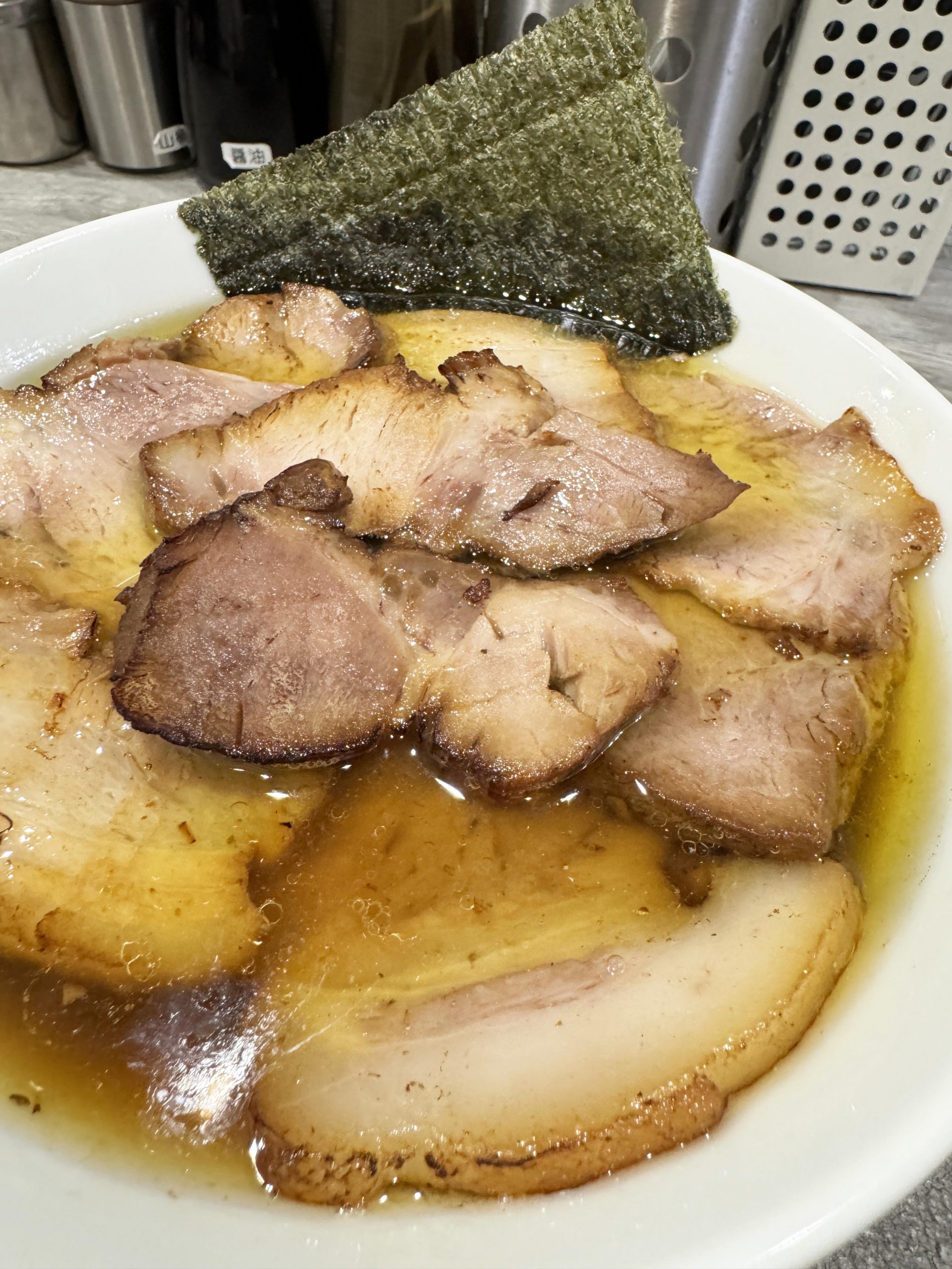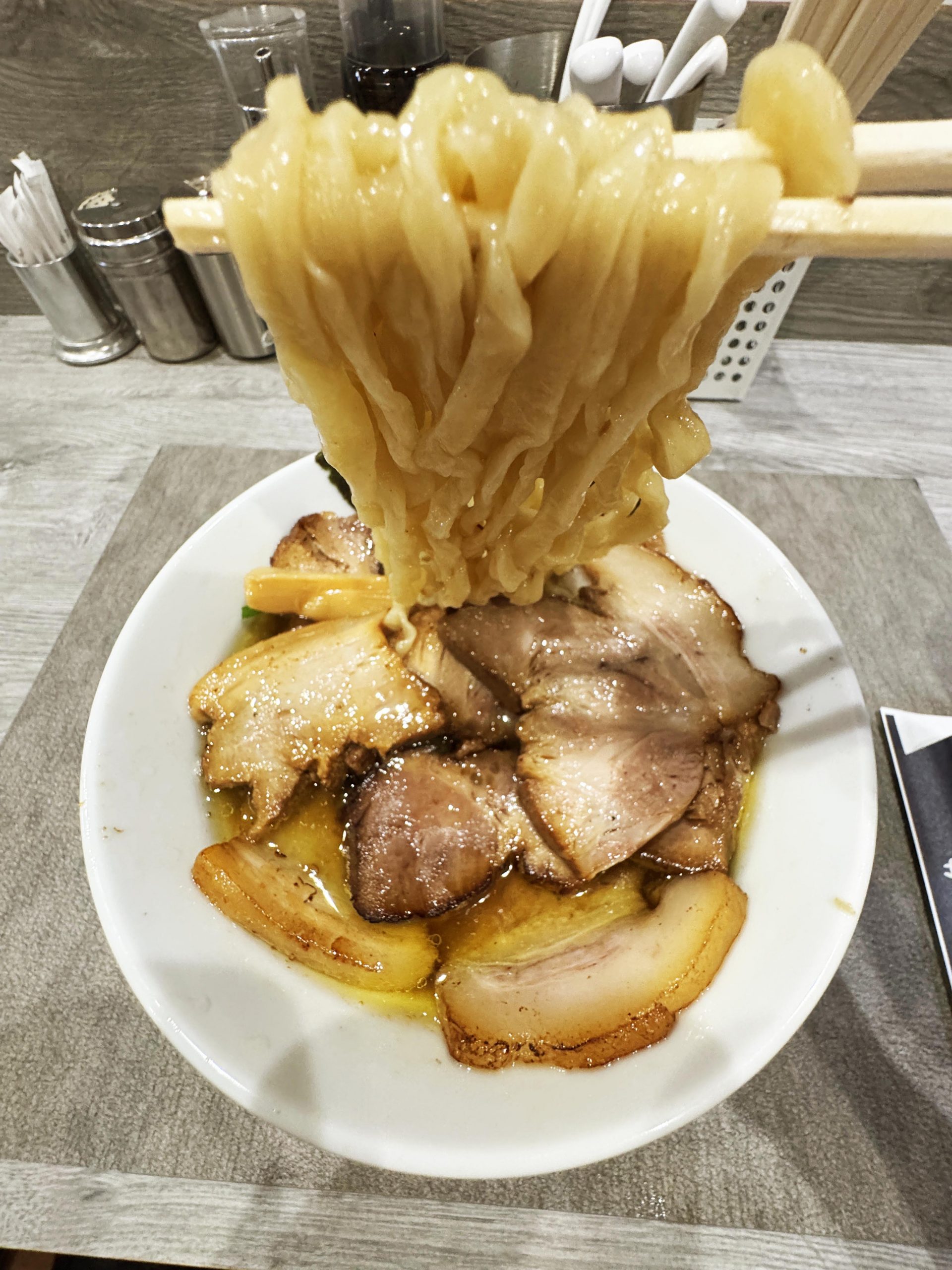 目の前にやってきたチャーシュー麺+炙りチャーシューは、まさにチャーシュー好きにとって神域レベルのビジュアルと薫り。極めておいしそうな香ばしさ。薫り高いチャーシューたまらない!