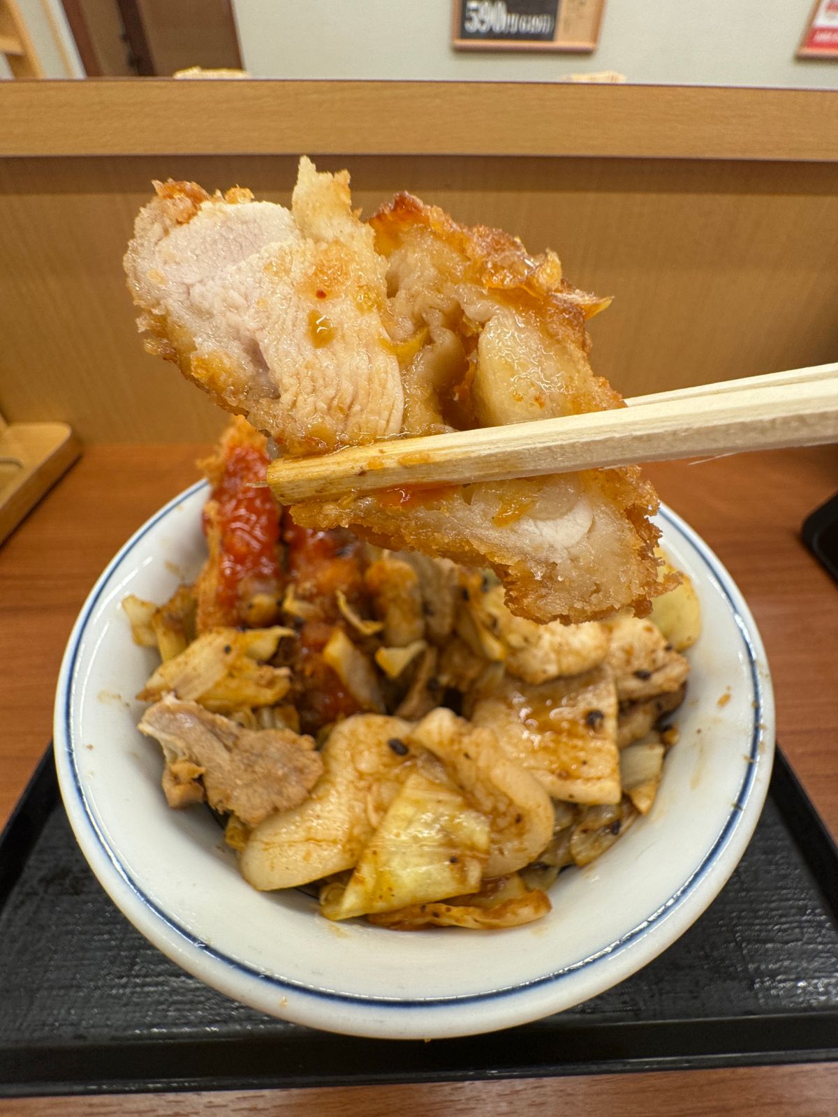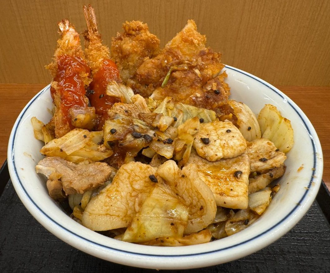 かつやが新たに発売を開始したマジ盛りグルメ「中華ざんまい丼」。具として海老チリと油淋鶏と回鍋肉が盛られており、この丼ひとつでご馳走をイッキに堪能できるガンギマリ仕様のメシである。