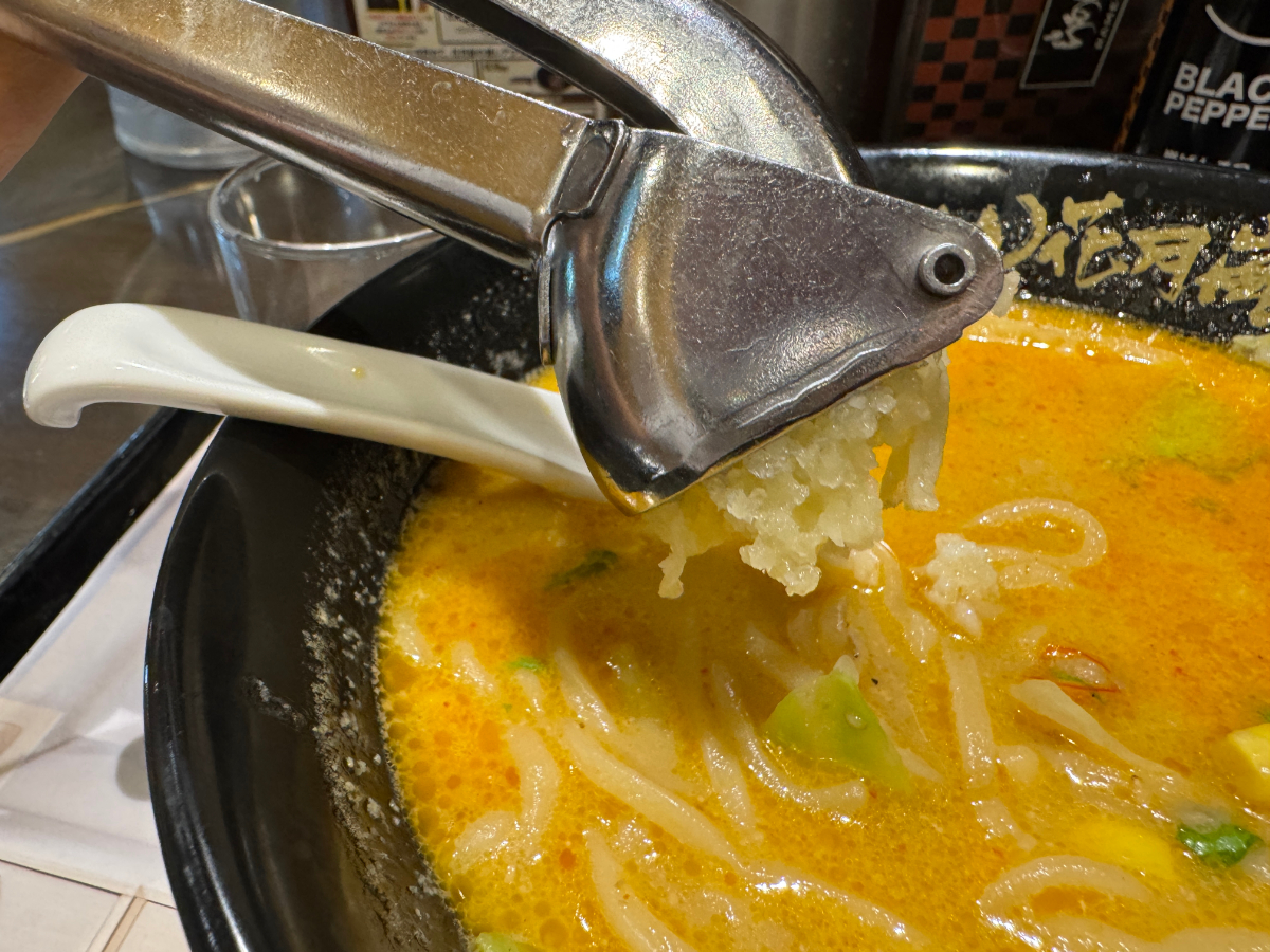 途中から、店員さんにお願いをして無料のニンニクをもらって投入。これがもう大正解。すでに「僕の味噌ラーメンⅡ」は完成形のラーメン。よってトッピングや調味料を足さなくともじゅうぶんなのだが、ニンニクを入れることで「クリーミィーさ」と「甘味」と「旨味」が際立つことがわかった。冴えたる刺激が、優しい味を浮き彫りにするのかもしれない。