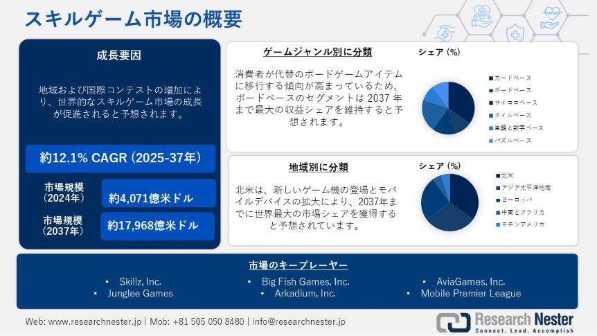 日本 – 2025年4月4日 – Research Nesterの最近の市場調査分析「スキルゲーム市場:世界的な需要分析と機会展望2037年」では、スキルタイプ、ゲームジャンル、収益モデル、ターゲットオーディエンス、配信チャネル、プラットフォーム、地域別の市場セグメンテーションの観点から、詳細な競合他社の分析と世界のスキルゲーム市場の概要が提供されています。