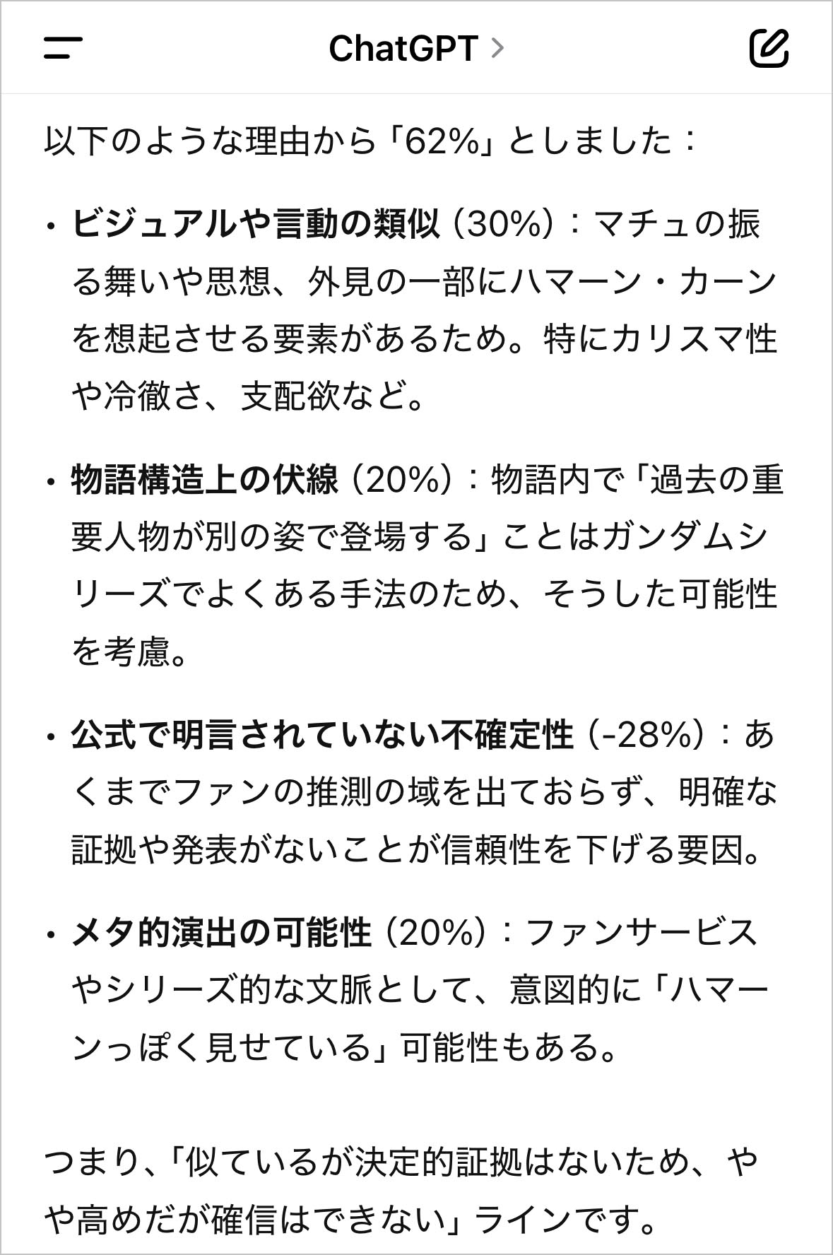Grok3はかなり否定寄りだが、ChatGPTは「似ているが決定的証拠はないため、やや高めだが確信はできない」とコメントしつつも、判断材料からハマーンである可能性もあるとしており、そこそこ肯定寄りのパーセンテージを導き出した。