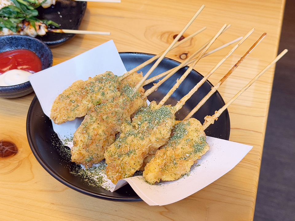 「串ナゲットグリーン」は、SUPER EIGHTのグループ名にちなみ、ささみ100%のチキンナゲット串が8本もお皿に乗っています。