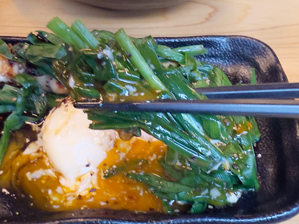 半熟卵を割って串に絡めて親子串にして食べるもヨシ、ニラと半熟卵でシャキシャキトロリを楽しむもヨシ。