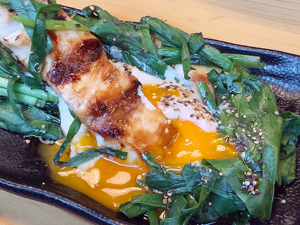 「ニラ玉グリーン」は、タレ焼きしたむね串にたっぷりのニラと半熟卵をトッピングした一品。この1皿でさまざまな食べ方が楽しめる、酒飲みにはたまらないメニューです。