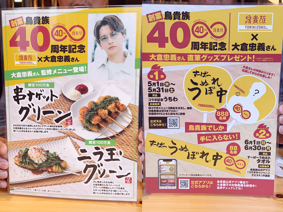 みんな大好き!全品均一価格の焼鳥屋「鳥貴族」が、創業40周年を記念して、本日5月1日より、SUPER EIGHTの大倉忠義さんとの夢のコラボメニュー「串ナゲットグリーン」と「ニラ玉グリーン」を発売しました。