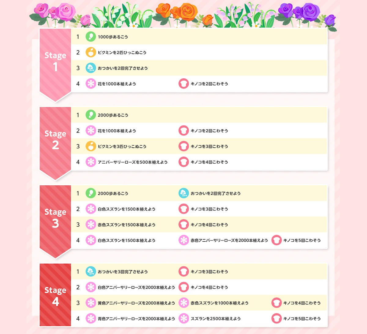 これは歩数やキノコの破壊、おつかいや花植えといった『ピクミン ブルーム』ではおなじみの体験を通じて進行するチャレンジ要素。