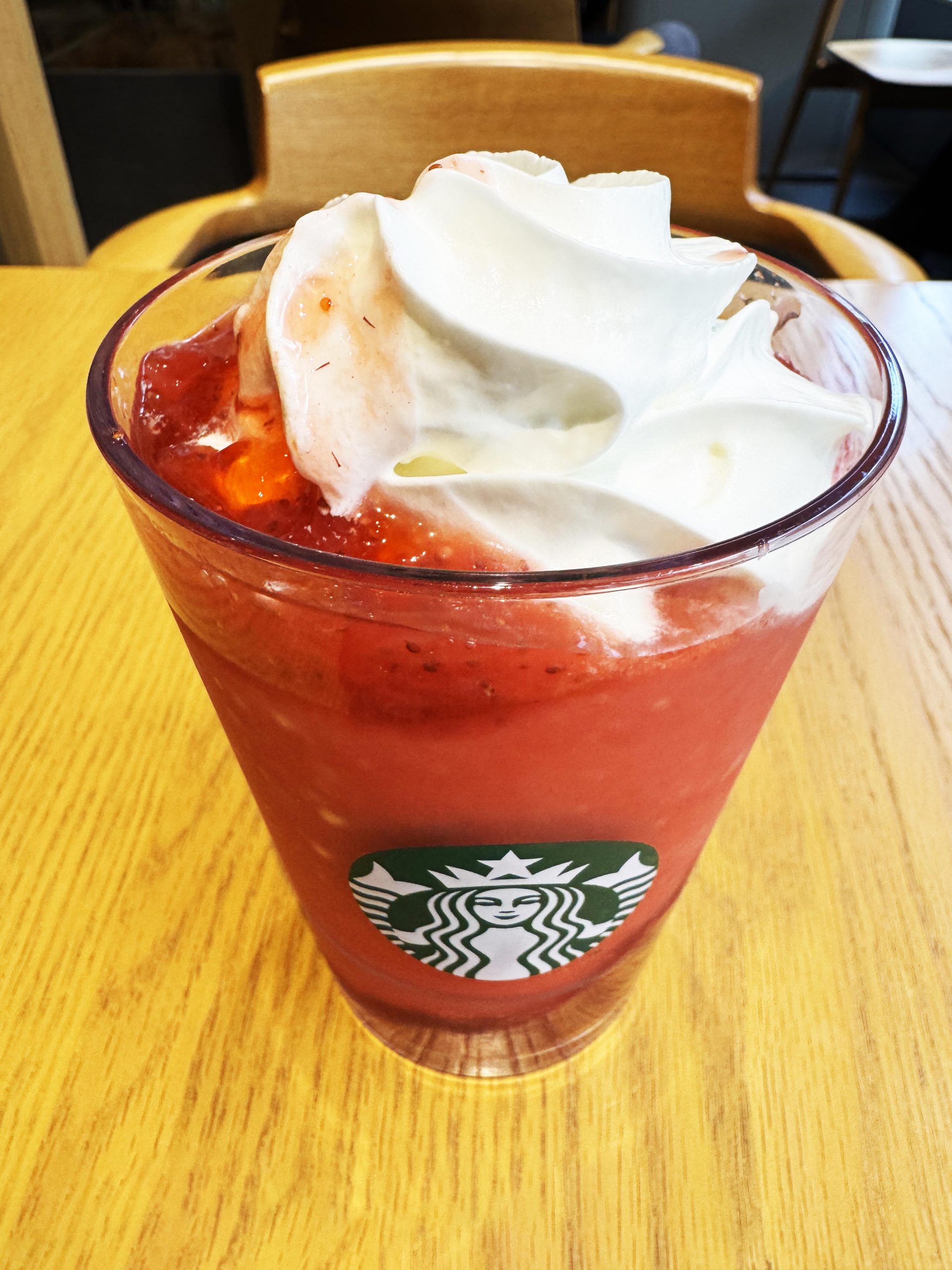 しかし、今回の「THE苺フラペチーノスペシャル」は、かき混ぜずに飲んでみてほしい。ストローを著しく底部まで至らせ、著しくズズッと吸い込むのである。そうすることで、著しくピュアでシンプルながらも濃密濃厚な苺テイストが味覚を訪れる。