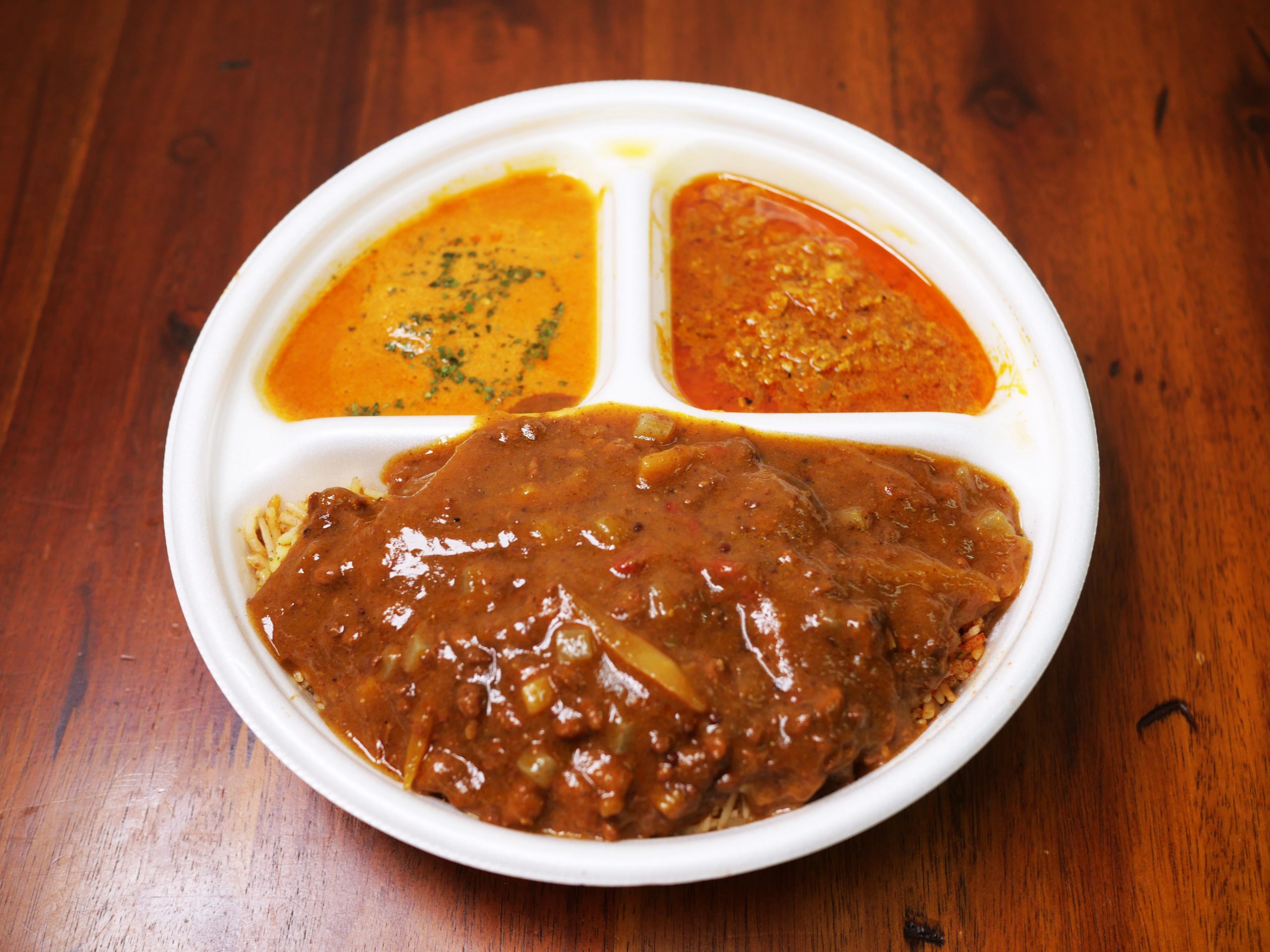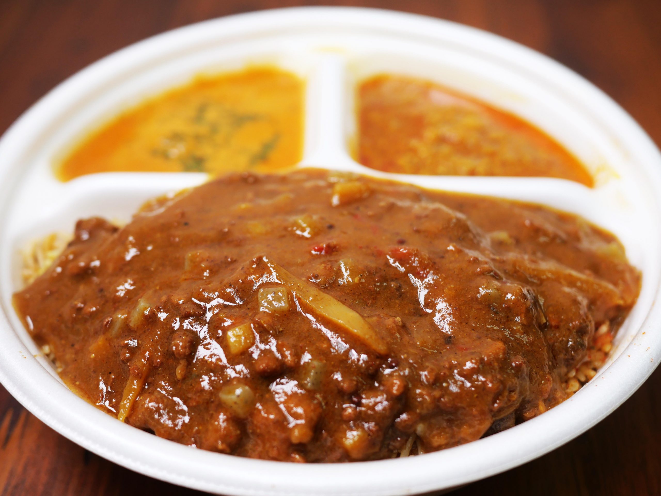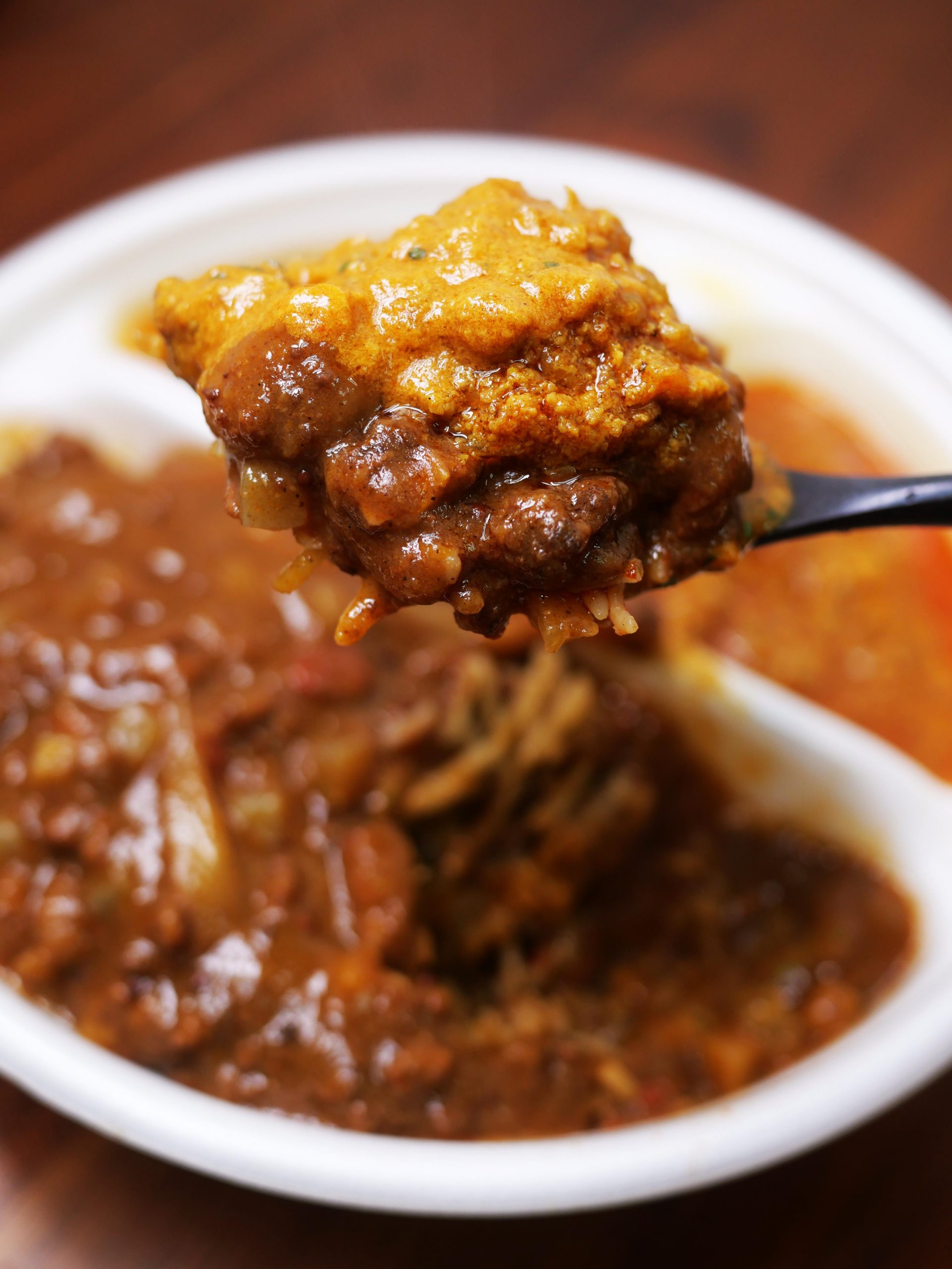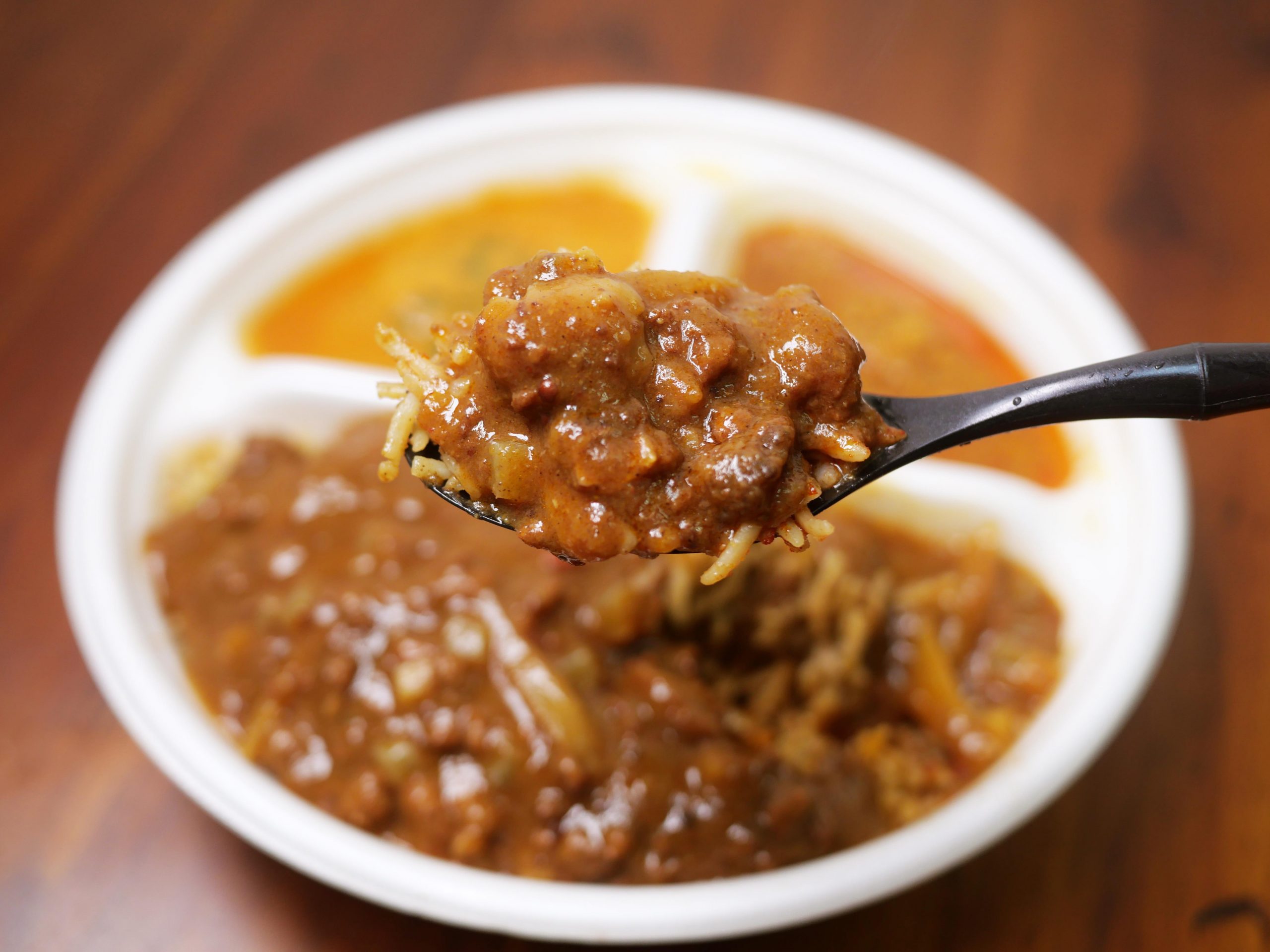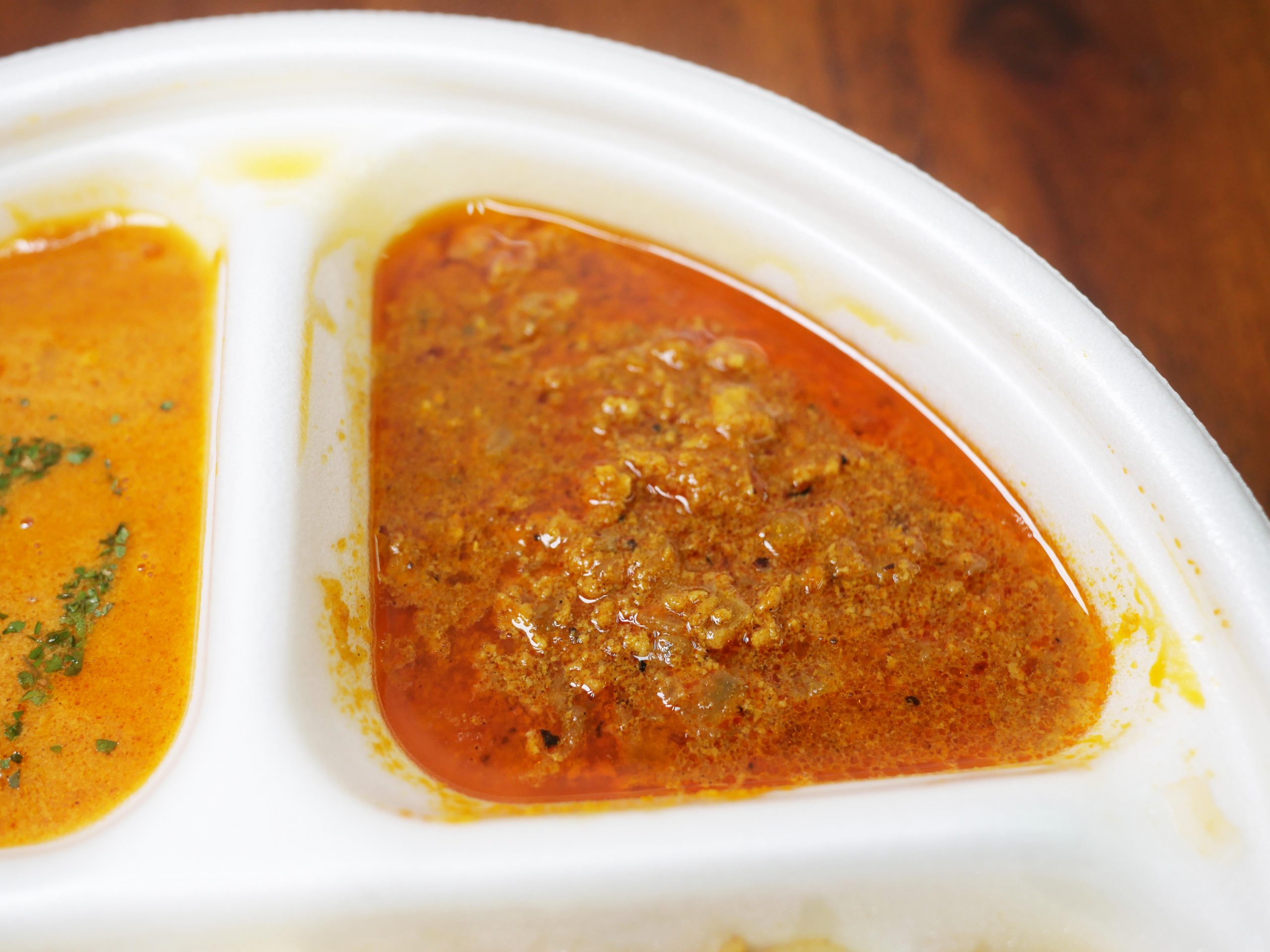 超ド級のディープな濃さを誇る牛豚キーマカレー。それが繊細な仕上がりのビリヤニと合流し、お互いがお互いの底上げ開始。爽やかなビリヤニのおかげで、カレーの奥底に眠る刺激が際立つ! たまらない。