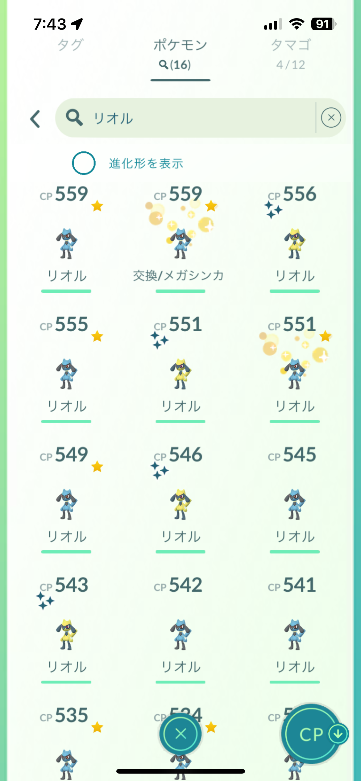 ▲アメの量に余裕があれば、CP順にリオルを並べ替えて、高CPの個体を複数匹進化させておくのもおすすめですよ。